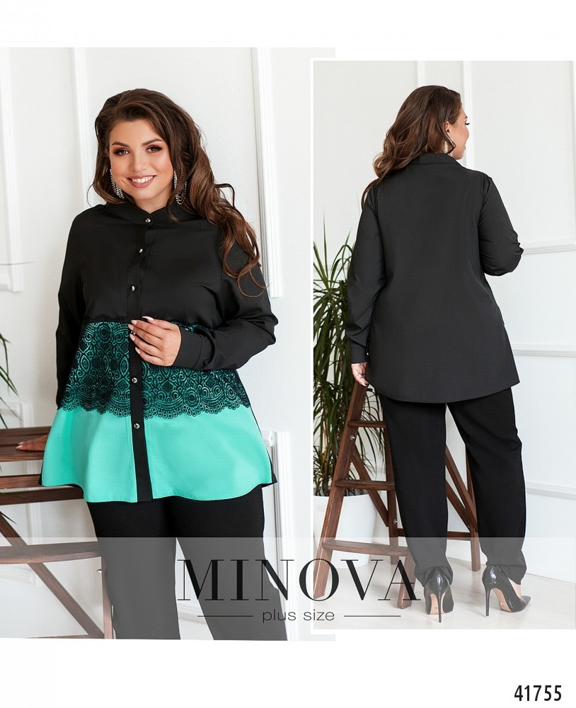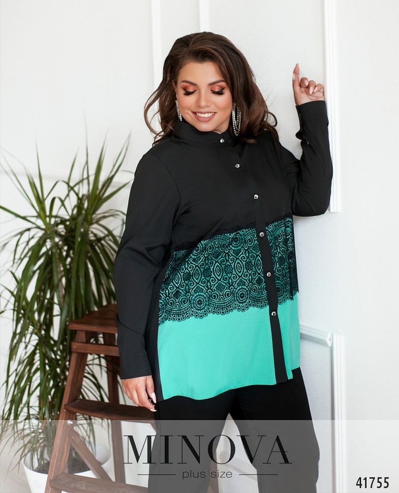 Романтичная рубашка батал с кружевом на талии, застёгивается на ряд пуговиц спереди на планке. Воротничок-стоечка, рукава с манжетами, на манжетах по одной пуговице. Без карманов.