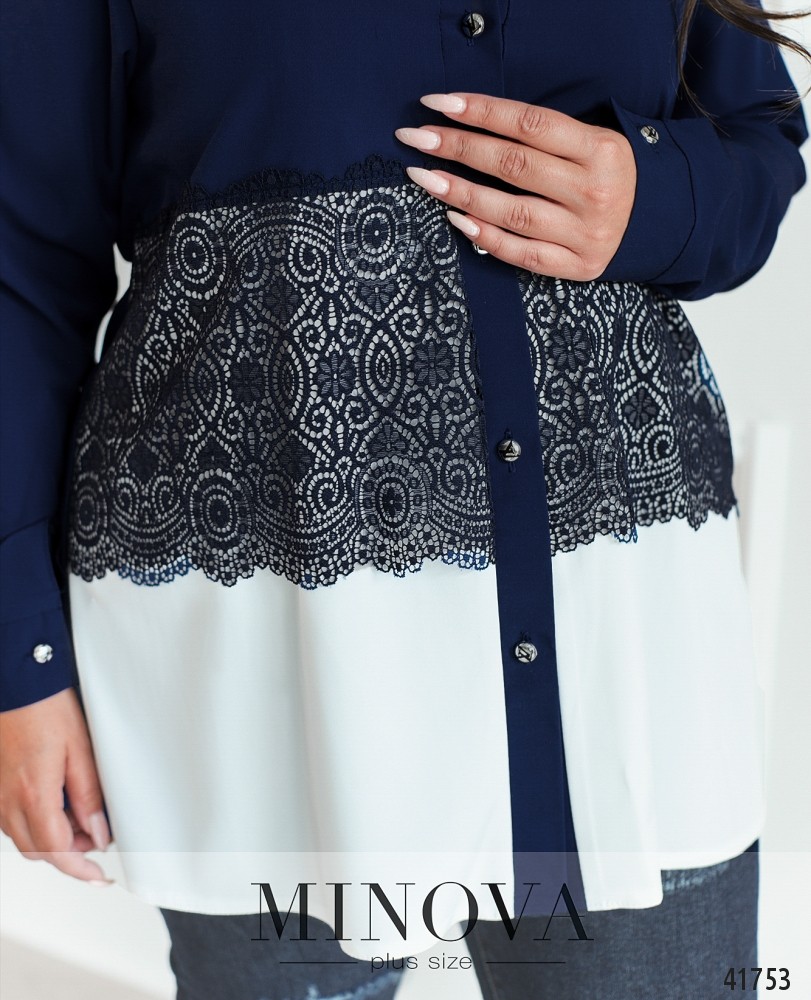 Романтичная рубашка батал с кружевом на талии, застёгивается на ряд пуговиц спереди на планке. Воротничок-стоечка, рукава с манжетами, на манжетах по одной пуговице. Без карманов.