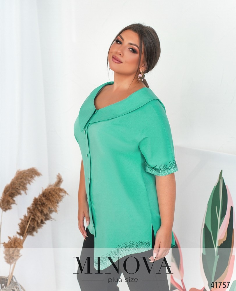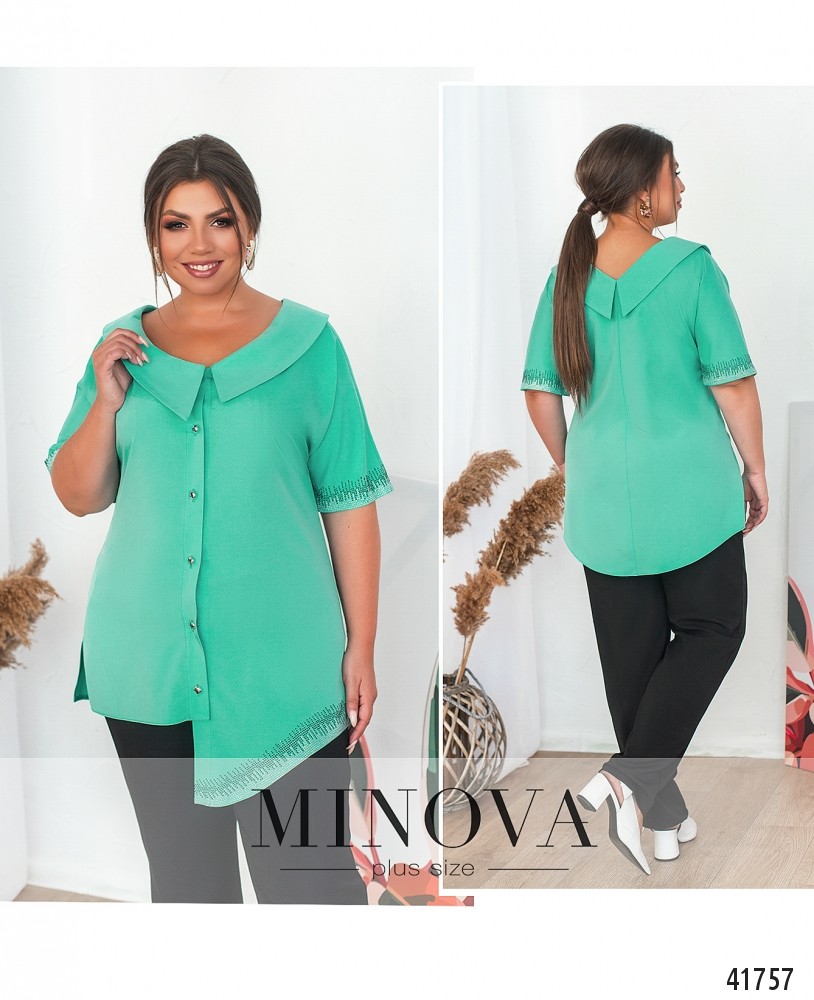 Элегантная рубашка батал с асимметричным подолом, украшена узором из страз по подолу слева, и на рукавах. Застёгивается на ряд пуговиц на планке. Без карманов, по бокам небольшие разрезы.