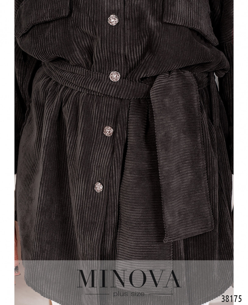 Очаровательная рубашка плюс сайз с широким поясом и двумя шлейками под пояс по бокам. На груди – накладные карманы, воротничок отложной, застёгивается рубашка на ряд пуговиц спереди на планке. На рукавах – небольшие манжеты с одной пуговицей. Без подкладки. Подол по спинке чуть длиннее.