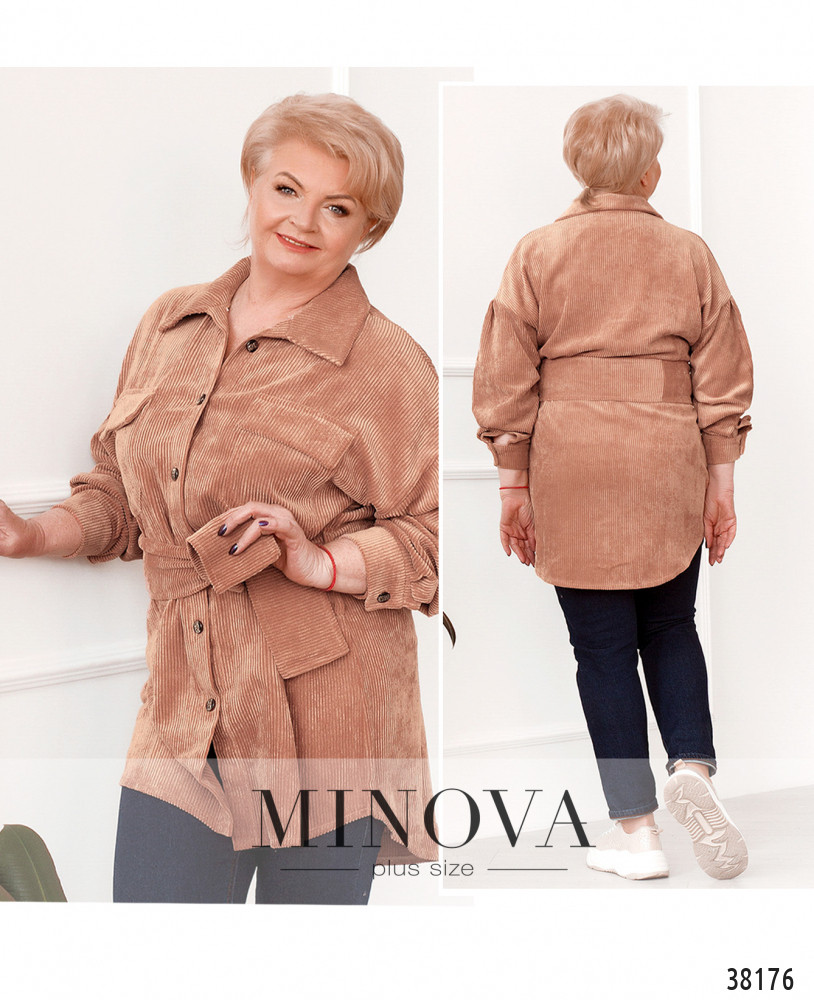 Очаровательная рубашка плюс сайз с широким поясом и двумя шлейками под пояс по бокам. На груди – накладные карманы, воротничок отложной, застёгивается рубашка на ряд пуговиц спереди на планке. На рукавах – небольшие манжеты с одной пуговицей. Без подкладки. Подол по спинке чуть длиннее.