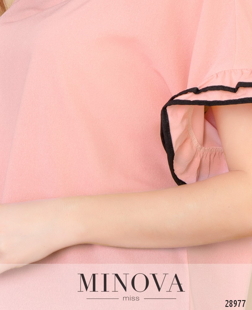 Свободная блуза прямого кроя с рукавами –воланами. Спинка украшена рядом декоративных пуговиц. Горловина, рукава и планка на спине выделены контрастным кантом.