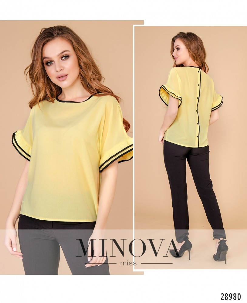 Свободная блуза прямого кроя с рукавами –воланами. Спинка украшена рядом декоративных пуговиц. Горловина, рукава и планка на спине выделены контрастным кантом.