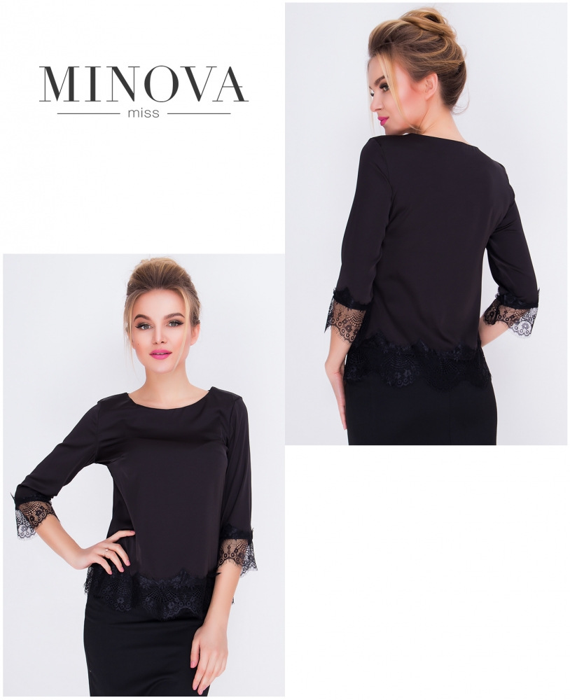 Шелковая блуза прямого кроя с круглым вырезом, кружевом на подоле и рукавах ¾.