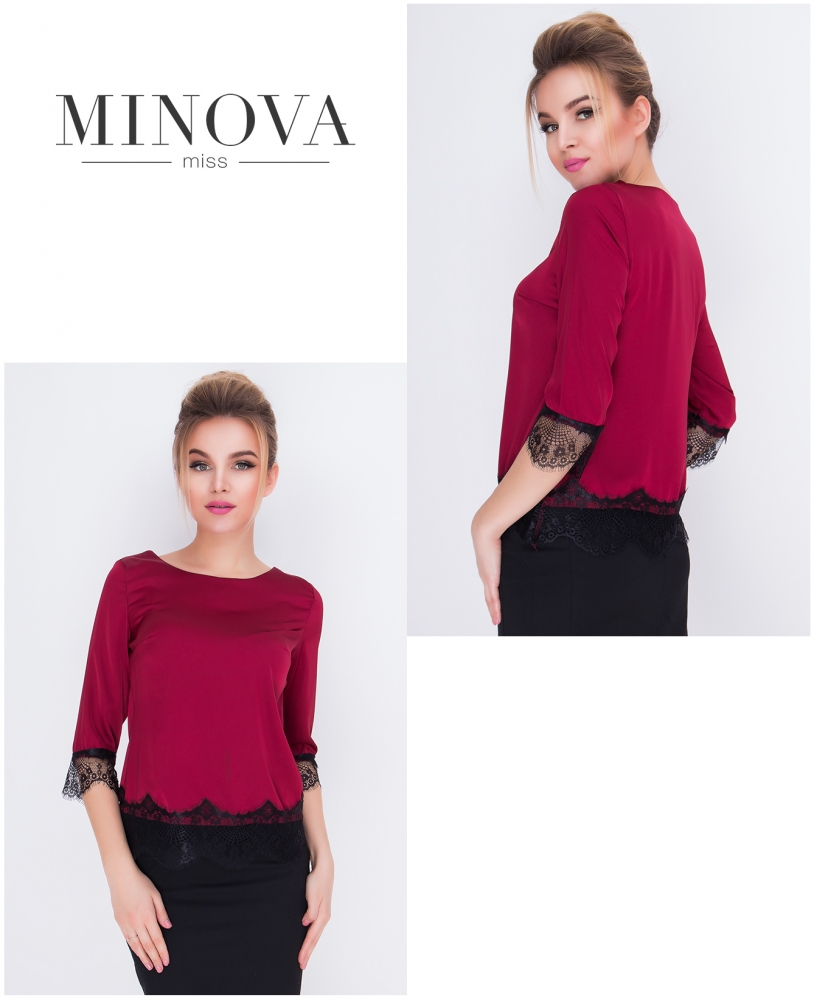 Шелковая блуза прямого кроя с круглым вырезом, кружевом на подоле и рукавах ¾.