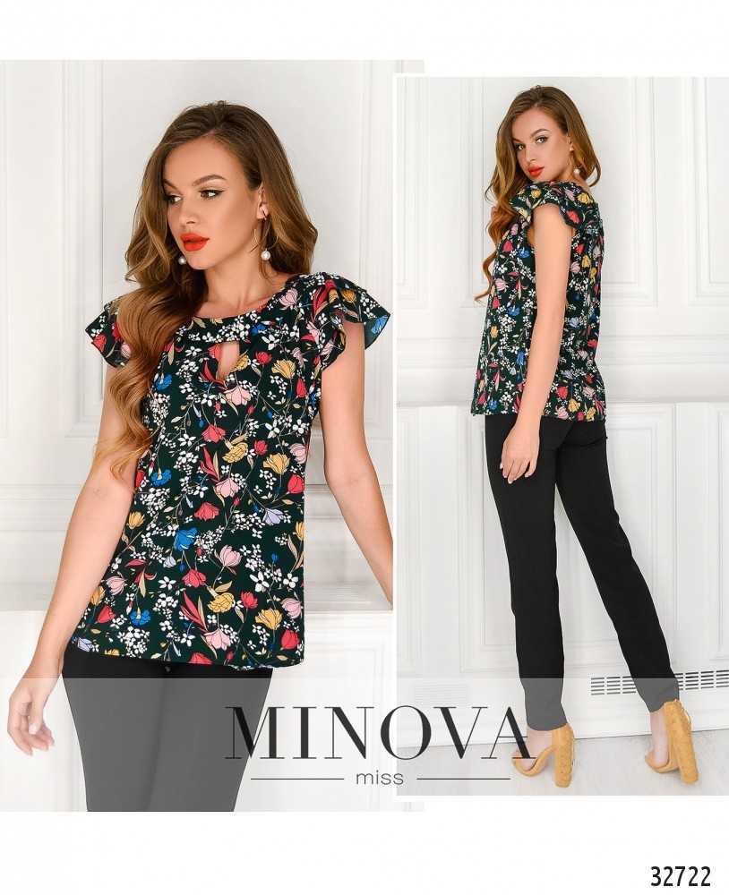 Живописный принт этой блузки из каталога летней одежды Minova особенно стильно смотрится на тёмном фоне. Любите быть неотразимой, создавать праздничное настроение? Этот вариант именно для вас! А если нравится фасон, но нужно что-то более строго-деловое, остановите свой выбор на белом варианте. У блузы широкая горловина, спереди под воротом небольшой вырез. На рукавах – два ряда нежных рюш. Крой прямой, без карманов и застёжек. Материал воздушный, не тянется, не просвечивает. Украсит гардероб девушек с «грушевой» или «яблочной» фигурой.