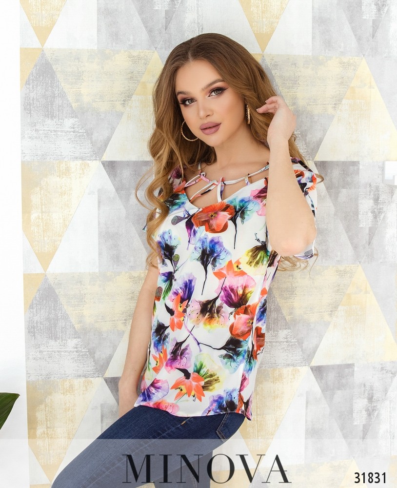 Яркий топ с оригинальной горловиной. Топ прямого кроя с короткими рукавами и закругленным подолом. V-образное декольте украшено декоративными петельками.