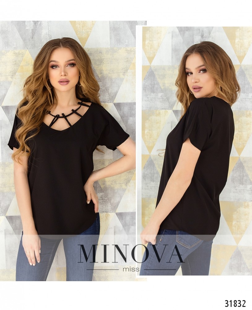 Яркий топ с оригинальной горловиной. Топ прямого кроя с короткими рукавами и закругленным подолом. V-образное декольте украшено декоративными петельками.