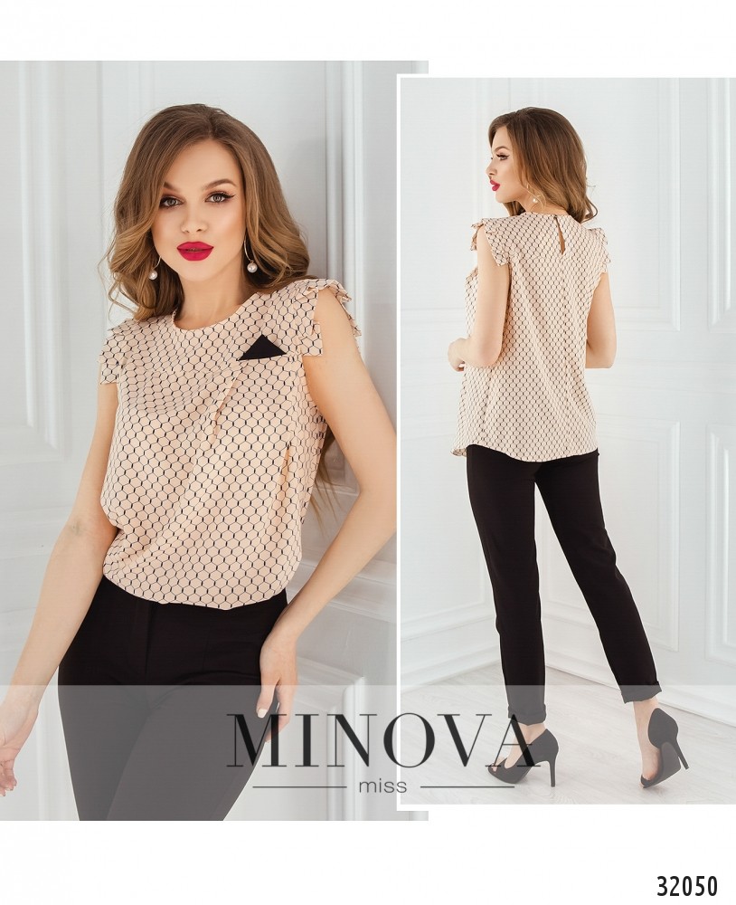 Свободная блуза без рукавов. Блуза, отрезная от кокетки, украшена декоративным кармашком. Рукава отделаны оборкой. Подол закруглен. Спинка отрезная кокетки. Горловина застегивается на пуговицу на спине.