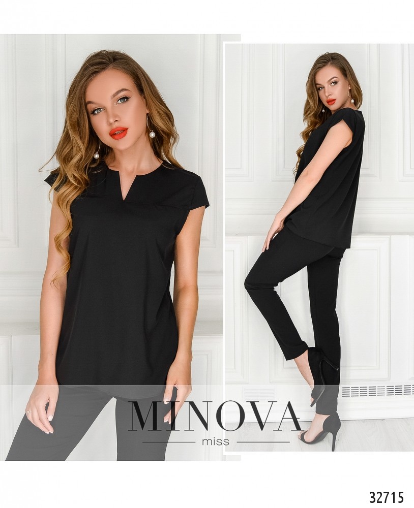Аккуратная и строгая – это именно про блузку из новой коллекции Minova. Оптимальный вариант для случаев, когда летом нужно придерживаться официальных требований к одежде. Прямой крой уравновешивается V-образным углублением в полукруглом вырезе горловины и такими же ромбовидными вырезами для рук. Собственно рукавов нет, но плечи прикрыты, так что жарко не будет, и правила дресс-кода соблюдены. Застёжек нет, зато есть маленькие вшитые карманы на груди. Материал лёгкий, не тянется и не просвечивает.