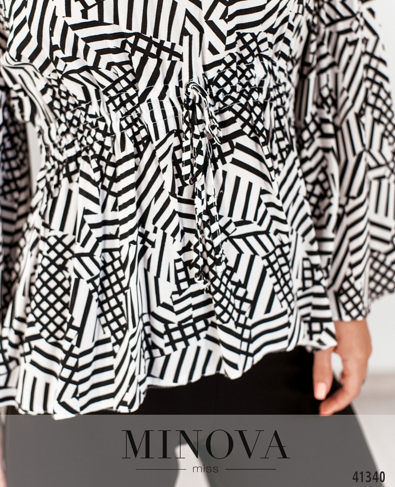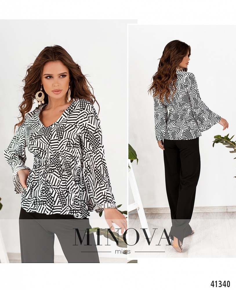 Удобная лёгкая блуза с рукавом-колоколом, в талию вшита резинка и шнурок, подол с оборками, карманов и застёжек нет. Вырез горловины V-образный.