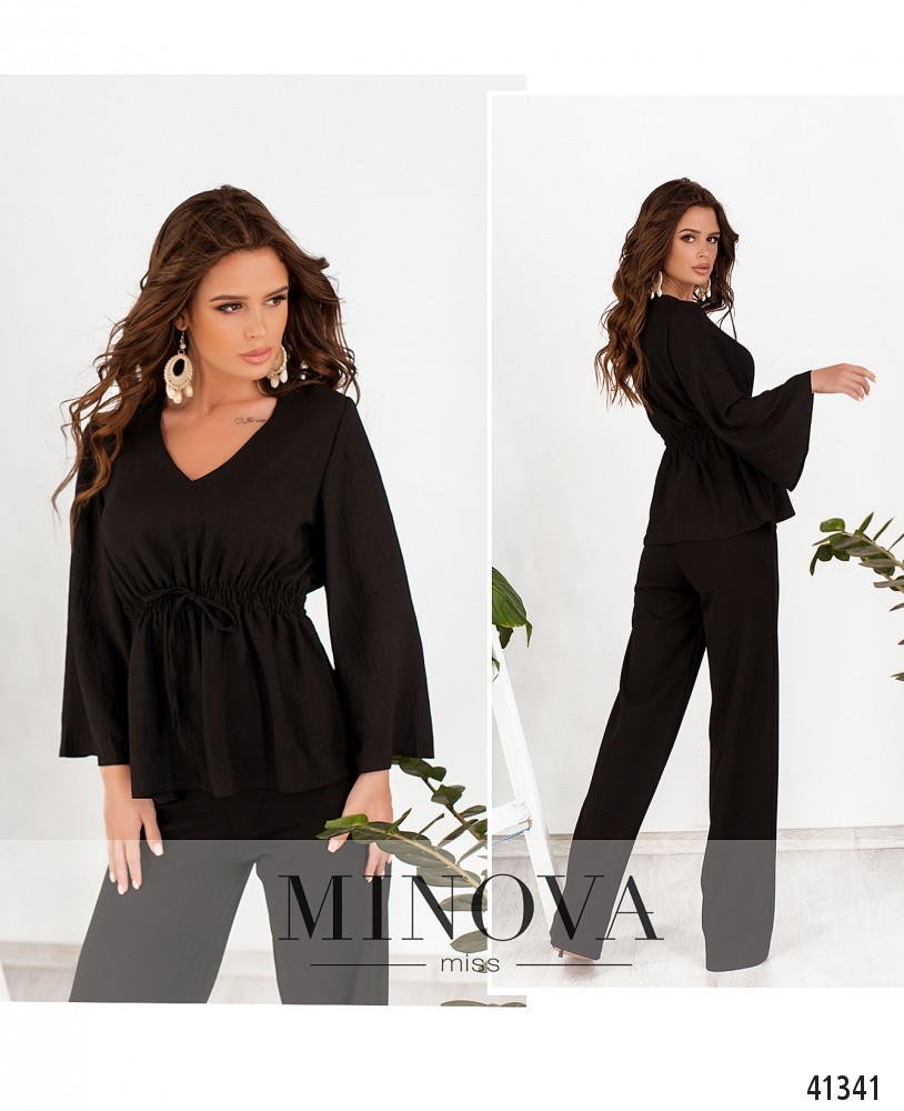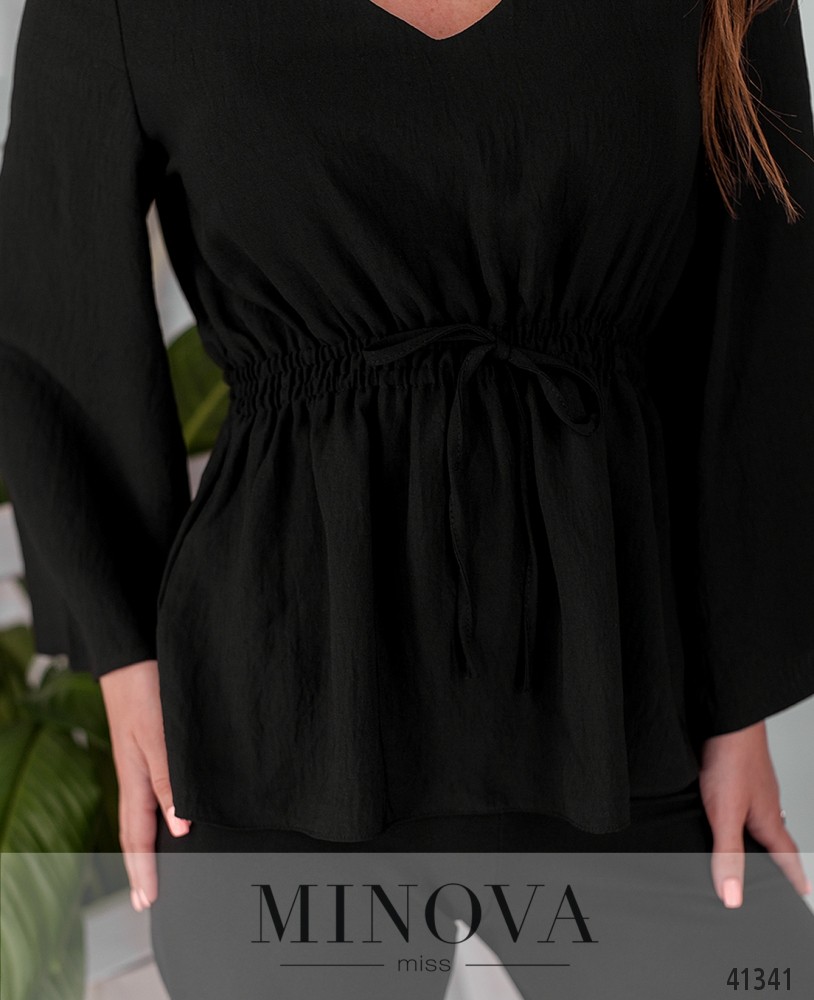 Удобная лёгкая блуза с рукавом-колоколом, в талию вшита резинка и шнурок, подол с оборками, карманов и застёжек нет. Вырез горловины V-образный.