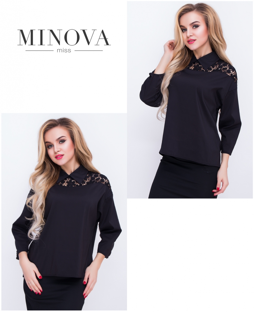 Расклешенная рубашка с кружевными вставками, рукавами ¾ и спущенным плечевым швом. Сзади воротник застегивается на пуговицу, подол удлинен.