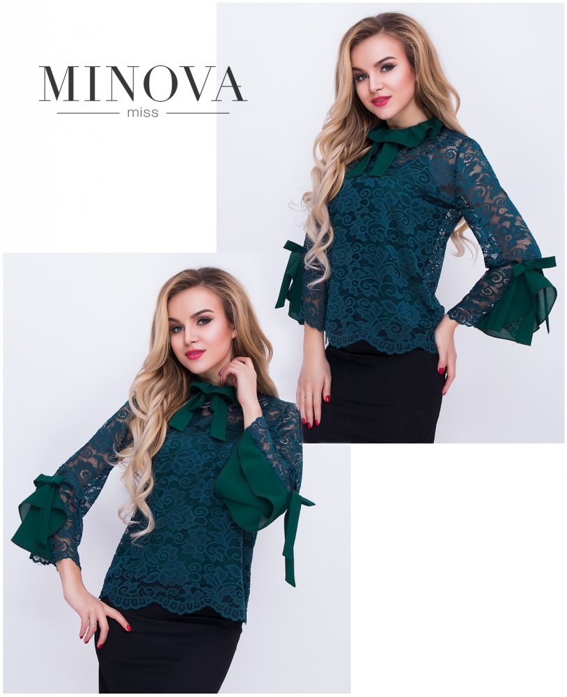 кружевная блуза с топом в тон, воротником-жабо с бантом и расклешенными