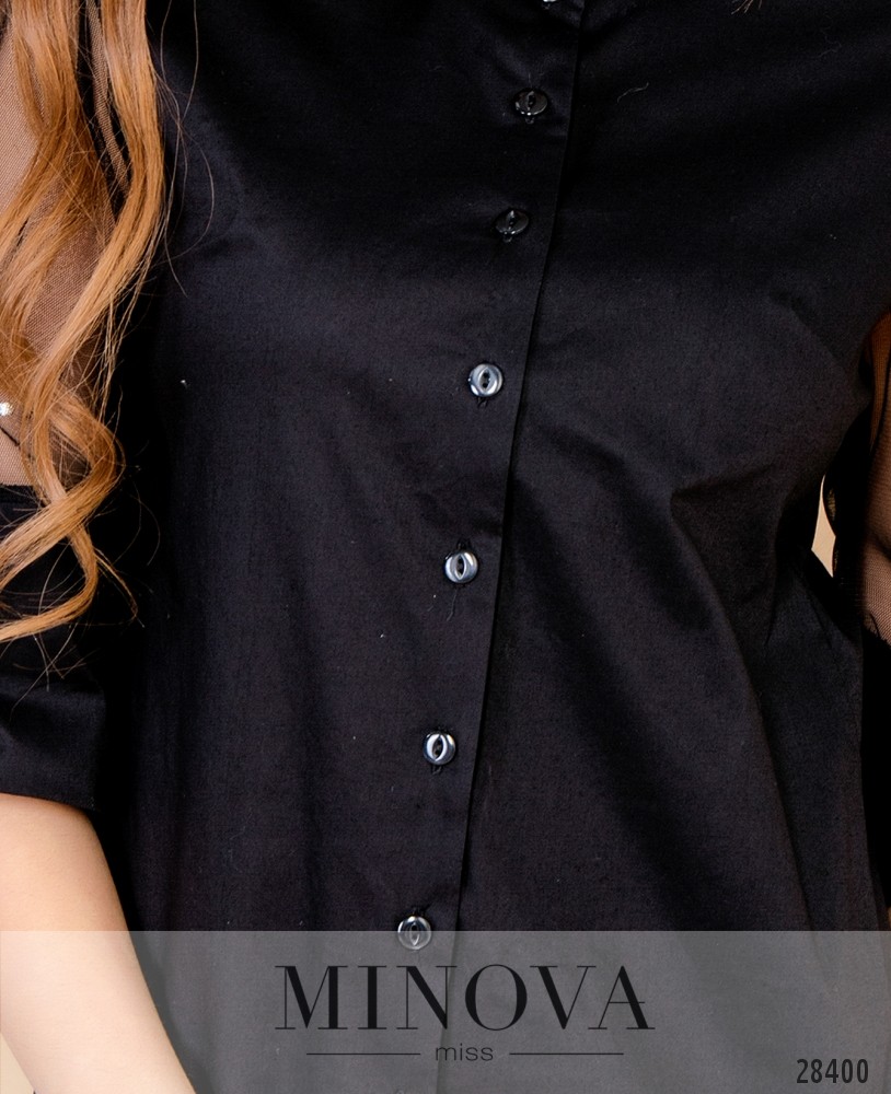 Рубашка с укороченными широкими рукавами. Рубашка прямого кроя застегивается на пуговицы на лицевой стороне. Рукава с широкими однотонными манжетами частично изготовлены из сетки и украшены бусинами.
