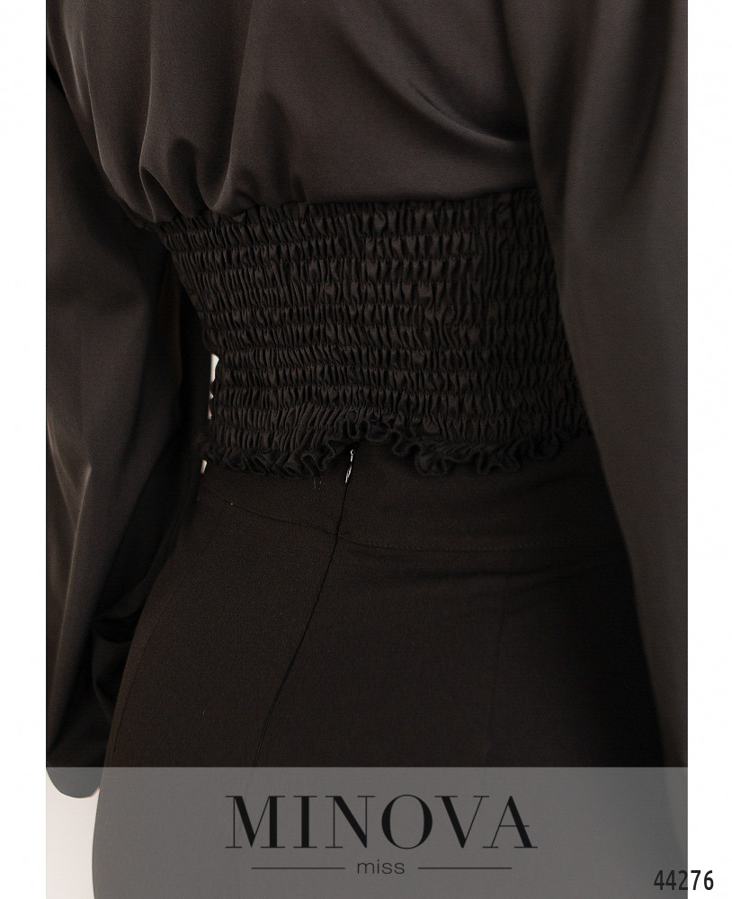 Стильная и оригинальная блуза в стиле корсета с высокой талией, лиф подшит к отрезной нижней части, по спинке она присобрана широкой резинкой. Спереди - ряд пуговиц. На груди ткань присобрана. В рукава на запястьях вшиты резинки. Карманов нет.