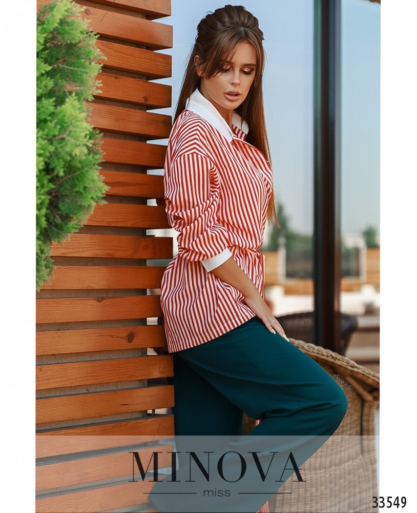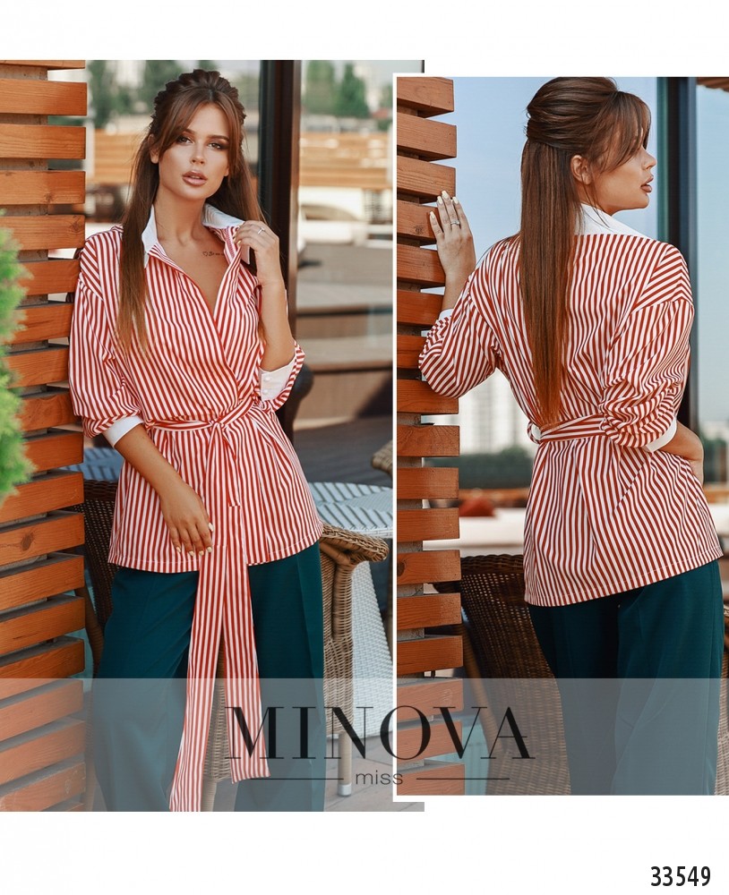 Очаровательная блуза прямого кроя из нового каталога Minova лёгким движением руки становится приталенной благодаря широкому поясу, который прилагается в комплекте. По бокам – две шлейки, через которые пропускается пояс. Можно выбрать однотонную тёмную или светлую расцветку, а можете остановиться на варианте в красно-белую полоску. Во всех моделях манжеты рукавов и отложной воротничок белые. Длина рукава – ¾. На манжетах – две «жемчужные» пуговки. Застёжки отсутствуют, блуза запахивается и закрепляется поясом. Ткань очень мягкая, лёгкая и приятная к телу. Хорошо будет сочетаться с брюками или джинсами.