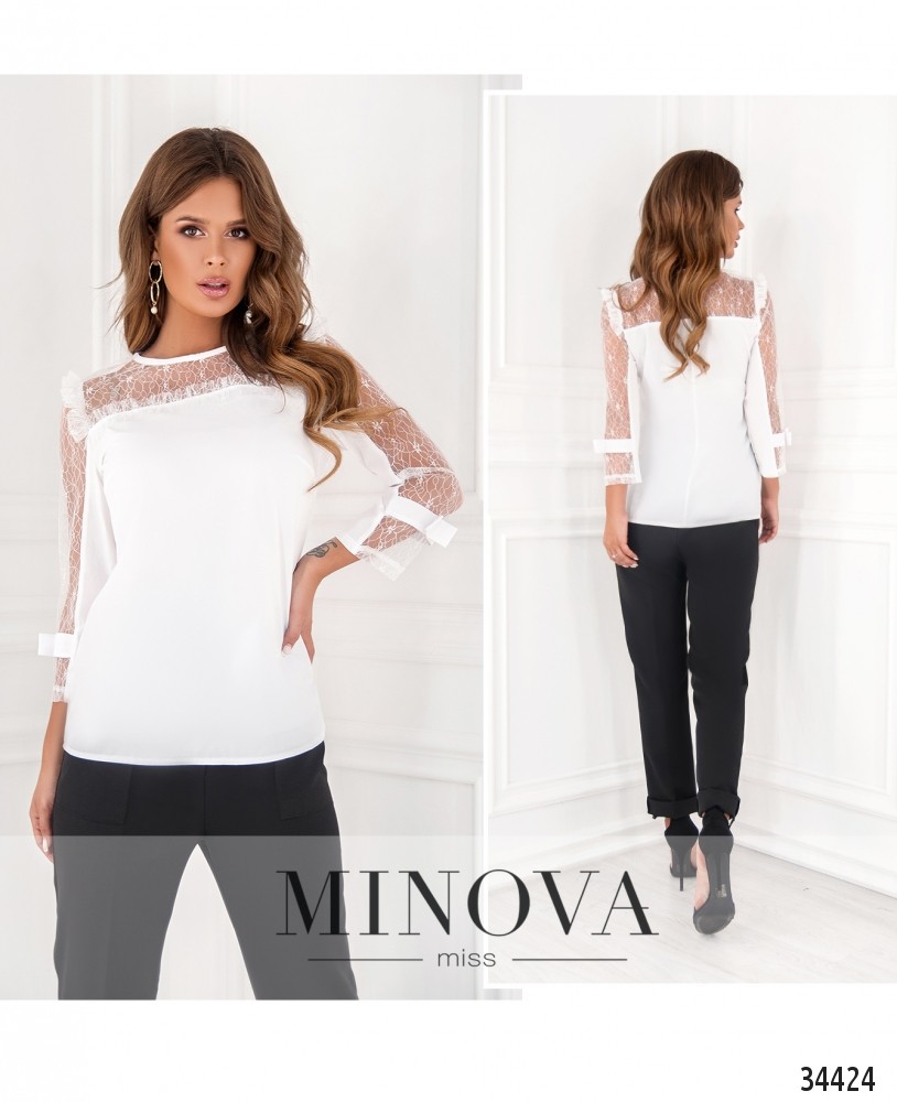 Нарядная и нежная блузка из каталога женской одежды от Minova придаст вашему официальному наряду нотку женственности и элегантности. Блуза из очень лёгкой ткани, украшена вставками тонкого гипюра на плечах, а рукава выполнены полностью из гипюра без подкладки и украшены тканевыми лентами-бантами чуть выше манжета. На груди – поперечные вытачки, застёгивается блуза на небольшую пуговку под шеей. В каталоге представлены классические цвета: чёрный и белый. Вы можете сочетать их с деловыми брюками, юбкой или даже с тёмными прямыми джинсами. Оттенить образ помогут яркие аксессуары. Блуза будет особенно удачно смотреться на фигуре типа «груша» или «яблоко».