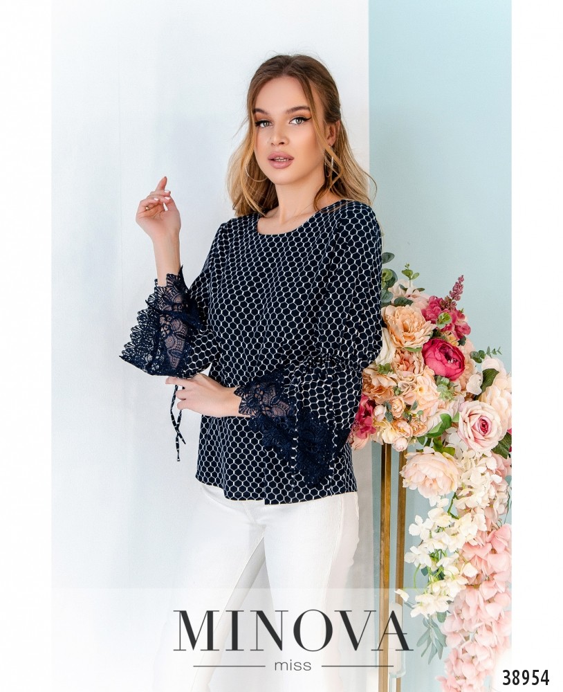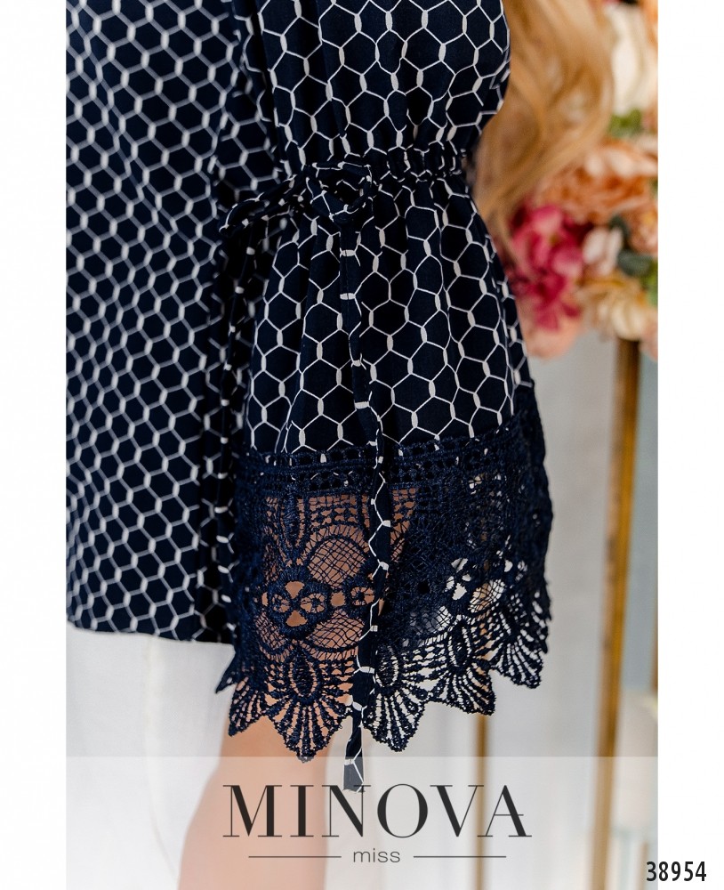 Нарядная рубашка с пёстрым принтом, рукава с расклешёнными манжетами, украшенными ажурным кружевом и ленточками. Вырез горловины полукруглый, карманов и застёжек нет.