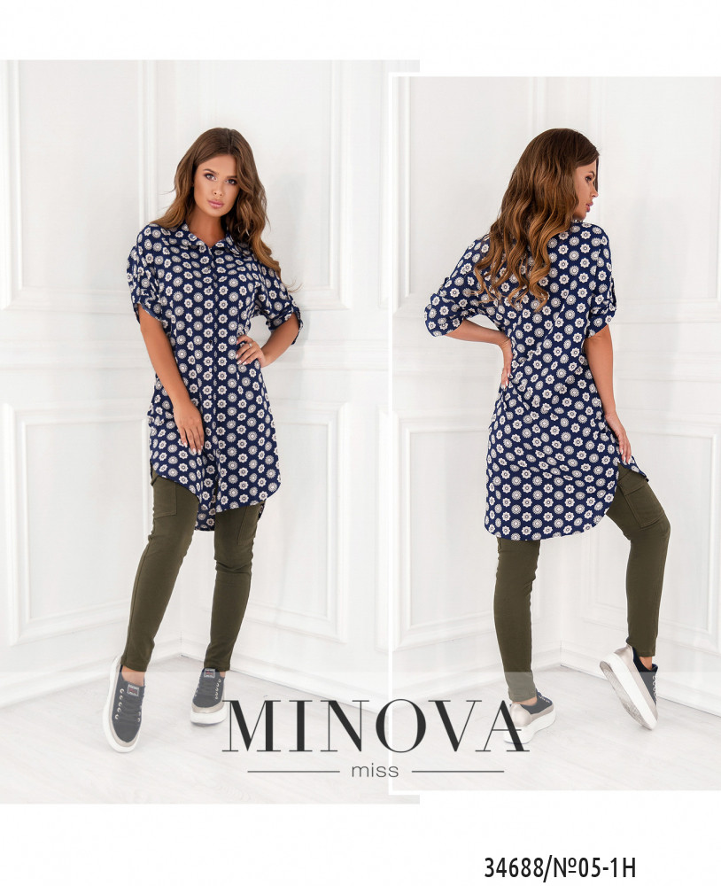 Если для вас главное – свобода и комфорт, то стоит купить для своего повседневного гардероба лёгкую тунику из нового каталога Minova. Туника пошита по фасону платья-рубашки, она длинная, мягкая и приятная к телу. Воротничок отложной, полный ряд пуговиц от воротника до подола. Рукава длиной ¾, без манжет. Подол по спине чуть длиннее. Карманов нет. Принт приятный и неброский: ряды круглых цветов, на светлом или тёмном фоне. Такой принт добавляет стройности и роста, поэтому лучше всего будет смотреться на фигуре типа «груша» или «яблоко». Можете носить тунику как самостоятельный элемент одежды или сочетать с джинсами, обувь может быть и спортивной, и классической на каблуке любой высоты. Украшение не входит в комплект. Пояс/аксессуар не входит в комплект.