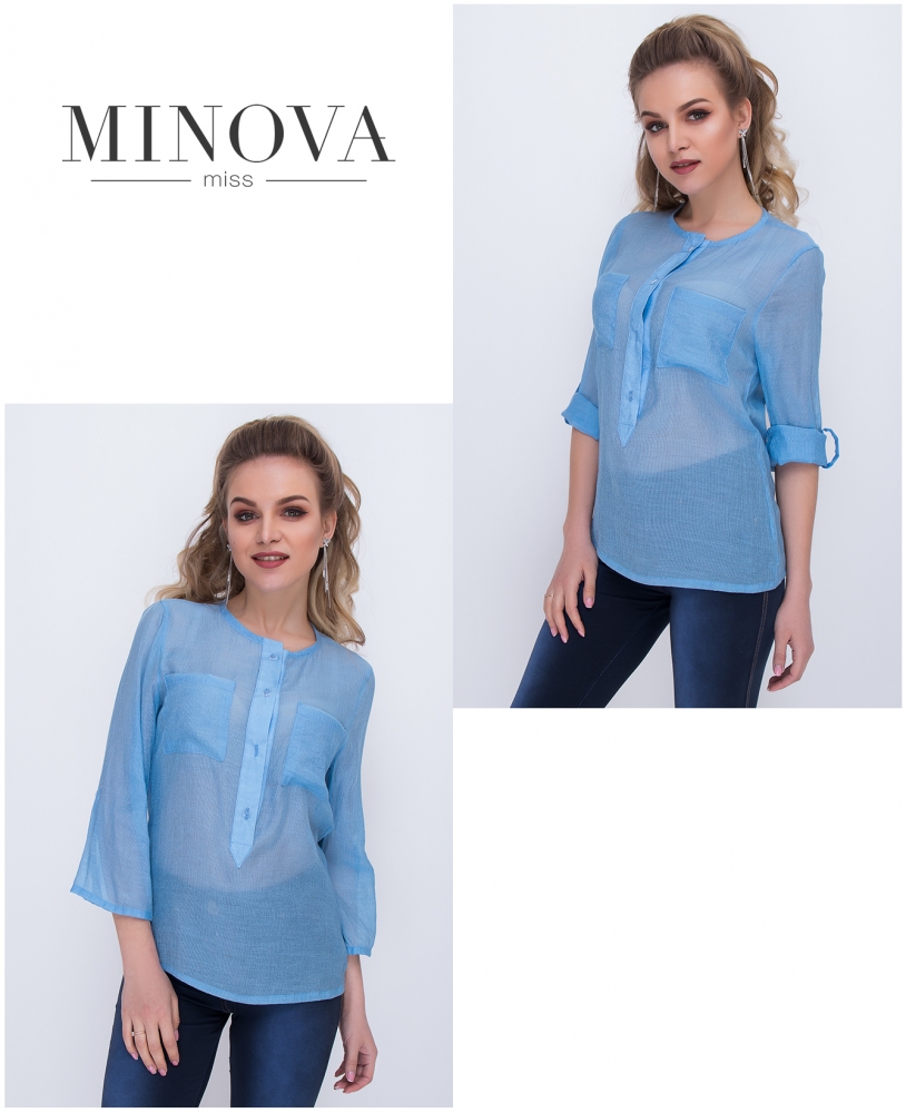 Рубашка прямого кроя с рукавами ¾. Ворот застегивается на пуговицы на планке. Рубашка дополнена накладными карманами. Рукава подворачиваются и фиксируются на пуговицу.