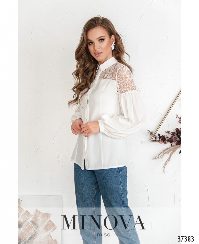 Праздничная рубашка из лёгкой ткани, украшенная кружевом на плечах и спине сверху. По центру – планка с полным рядом пуговиц. Рукава с небольшими манжетами, на манжетах по одной пуговице. Подшиты к кружеву и присобраны. Спереди и по спинке – продольные вытачки. Воротничок отложной.