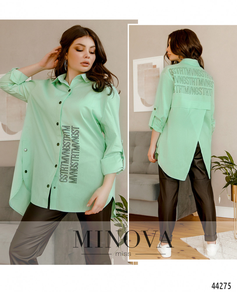 Длинная стильная рубашка с накаткой и фурнитурой хорошего качества. Воротник отложной, рубашка застёгивается на ряд кнопок спереди на планке. Украшена принтом на полочке. Рукава регулируются с помощью ленты и кнопки, на манжетах также по одной кнопке. По спинке подол отрезной, снизу запахнутый, спинка также украшена принтом. По бокам подола - разрезы, застёгиваются на кнопки. Карманов нет.