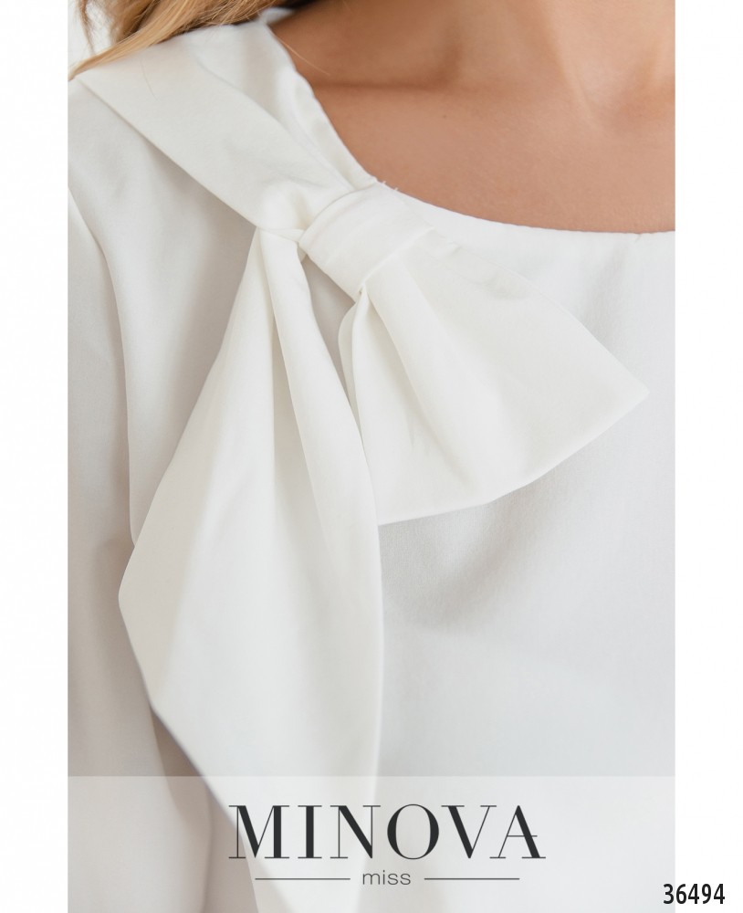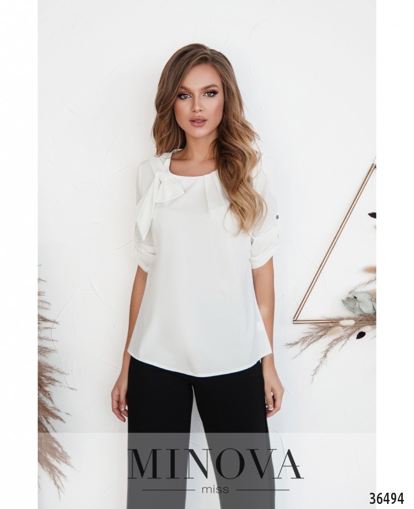 Бант – элемент женственности и романтичности. Minova представляет очаровательную модель блузки с небольшим аккуратным бантом на правом плече. Также блузка хороша тем, что она из лёгкой, приятной к телу ткани, без принта, поэтому вполне универсальна. Рукава длиной ¾, с небольшими манжетами. На манжетах по одной пуговице. Вырез горловины неглубокий, полукруглый, застёжек и карманов нет. Крой свободный, А-силуэта. Можешь носить навыпуск или заправлять в брюки или джинсы, и лучше без пиджака, чтобы главный декоративный элемент оставался на виду. Будет хорошо смотреться на любой фигуре.
