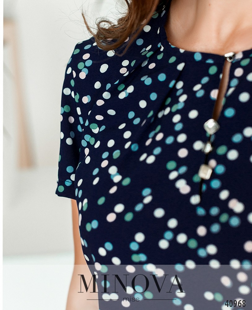Яркая блуза в горошек, вырез горловины полукруглый, под ним - ряд пуговиц с петельками-резинками. Рукава короткие, без манжет. Карманов нет. Ткань под горловиной присобрана декоративными складками.
