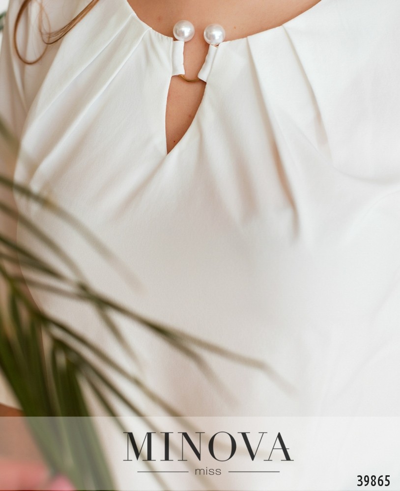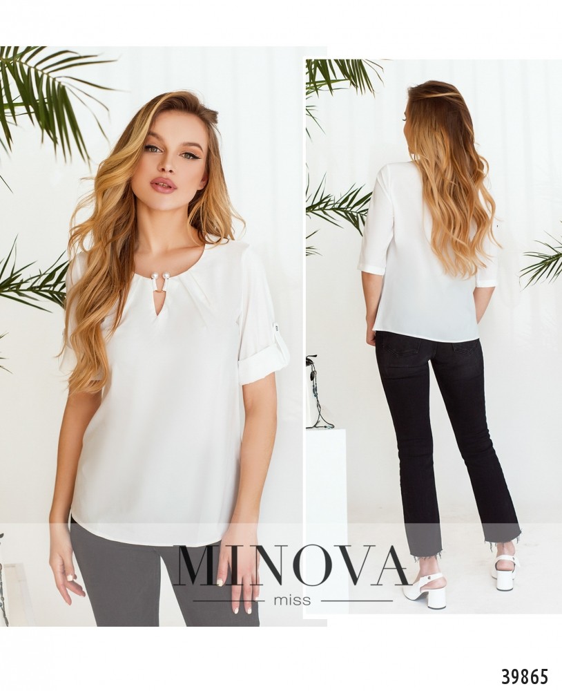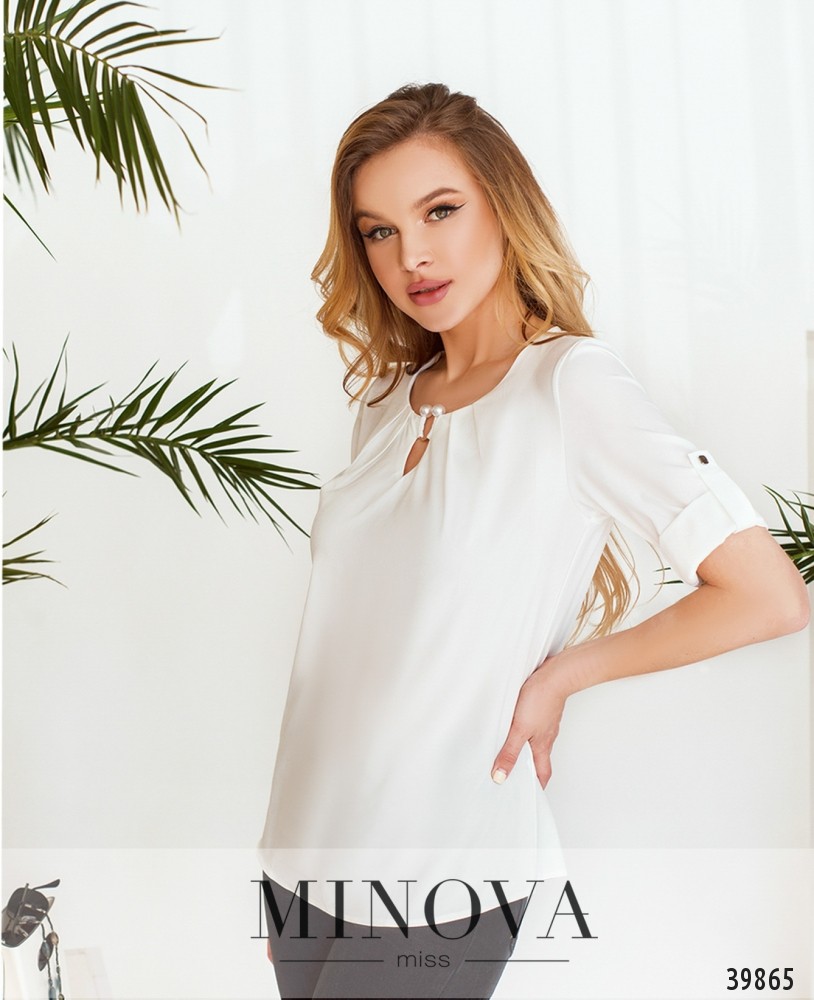 Очаровательная блуза без застёжек и карманов, украшена металлическим декором на полукруглом вырезе горловины. Рукава без манжет, регулируются на пуговицу и ленту. Ткань под горловиной присобрана.