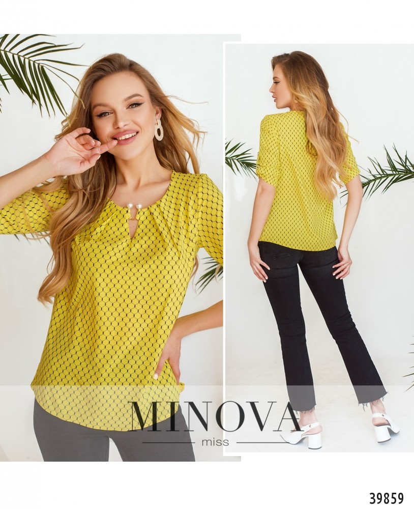 Очаровательная блуза без застёжек и карманов, украшена металлическим декором на полукруглом вырезе горловины. Рукава без манжет, регулируются на пуговицу и ленту. Ткань под горловиной присобрана.