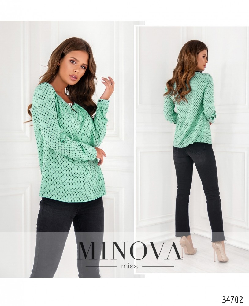 Очень нежная, лёгкая и приятная к телу и на вид блуза из новой коллекции Minova. Блуза с полукруглым вырезом горловины, под ним – несколько вытачек-оборок, которые создают эффект А-силуэта. Застёжек и карманов нет. Рукава полной длины, но их можно укоротить с помощью ленты и пуговицы. На рукавах – неширокие манжеты с одной пуговкой на ножке. На вырезе горловины – небольшая металлическая полукруглая «брошка» с «жемчужными» наконечниками. Крой свободный, а расцветку выбирайте в зависимости от своего привычного гардероба и требований к дресс-коду – можно выбрать пастельный оттенок с принтом в виде пчелиных сот, в наличии также чисто белый и красный вариант, и самые нарядные модели – с акварельными цветами, которые любой наряд сделают праздничным и радостным! Рубашка такого фасона будет удачно смотреться на любой фигуре.