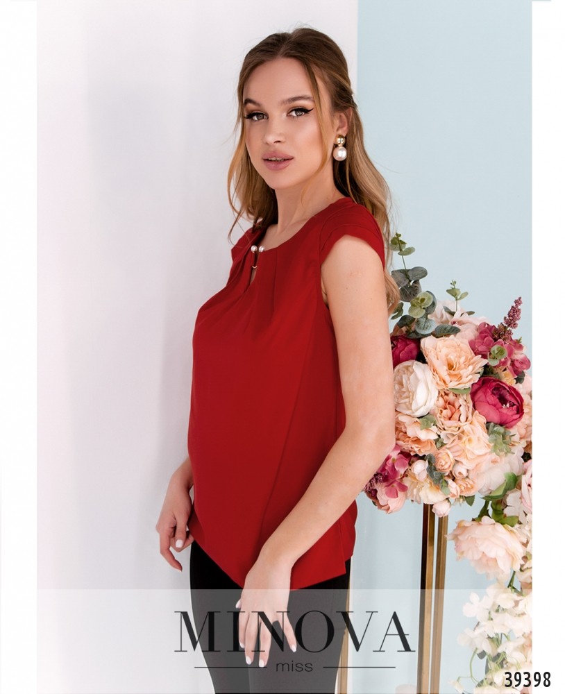 Элегантная минималистичная блуза плюс сайз с рукавом-лепестком, вырез горловины полукруглый, украшен золотистой "подковкой" с "жемчужными" бусинами. Ткань спереди присобрана, карманов и застёжек нет.