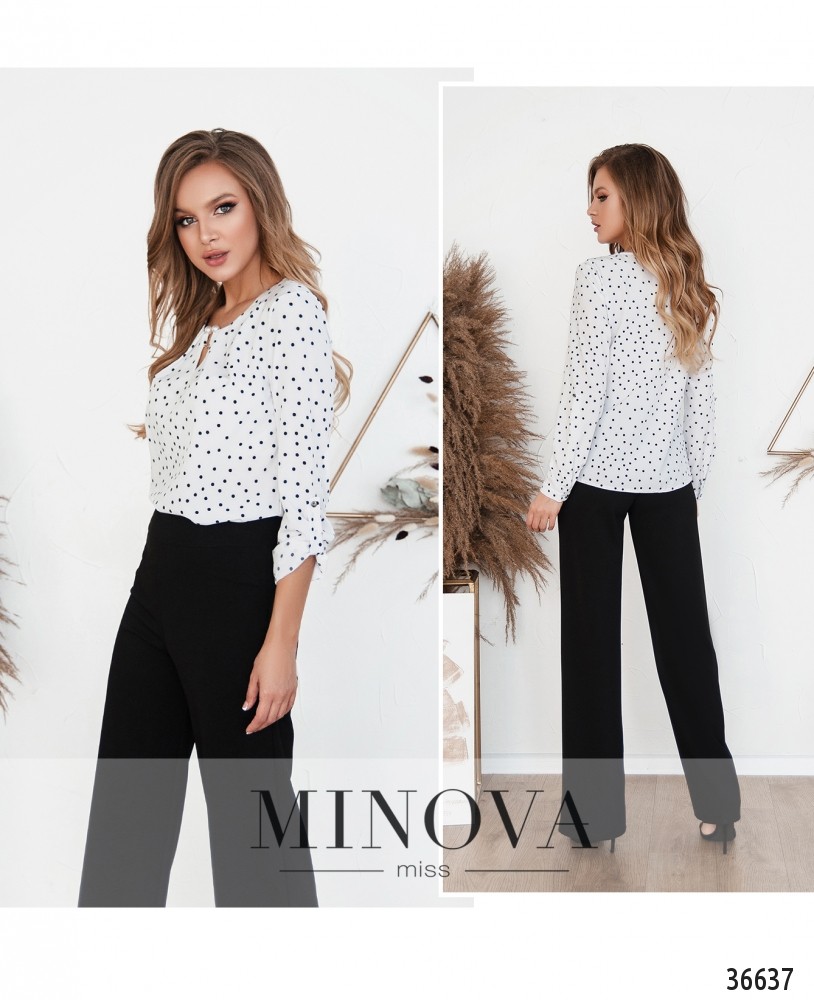 Лёгкая, воздушная, очень нарядная блуза на каждый день или на праздник – в зависимости от того, какой оттенок или принт ты выберешь. В каталоге Minova представлены модели в принт «шестиугольник», в горошек и однотонные. Цвета – пастельные, яркие или классические. Блуза без застёжек и карманов, рукава полной длины, с небольшими манжетами, на манжетах – по одной пуговке. Регулируются на пуговку и ленту. Вырез горловины полукруглый, неглубокий, спереди ткань присобрана и закреплена очаровательной металлической «брошкой» с «жемчужными» наконечниками. Блуза свободного кроя, её лучше носить навыпуск.