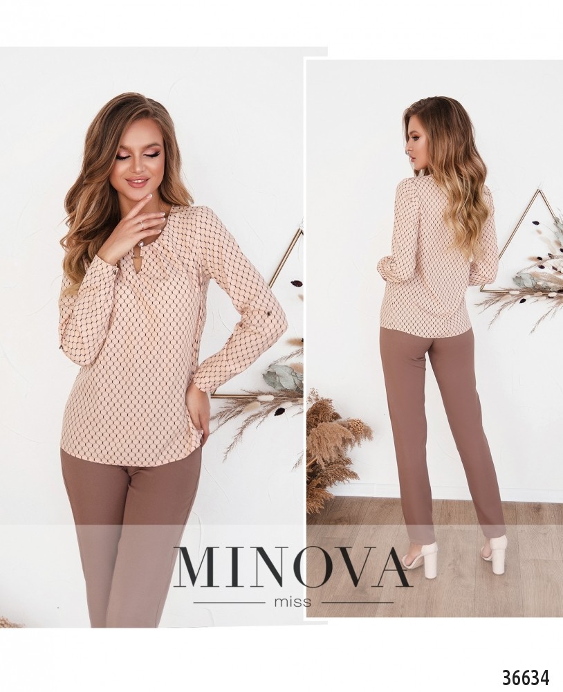Лёгкая, воздушная, очень нарядная блуза на каждый день или на праздник – в зависимости от того, какой оттенок или принт ты выберешь. В каталоге Minova представлены модели в принт «шестиугольник», в горошек и однотонные. Цвета – пастельные, яркие или классические. Блуза без застёжек и карманов, рукава полной длины, с небольшими манжетами, на манжетах – по одной пуговке. Регулируются на пуговку и ленту. Вырез горловины полукруглый, неглубокий, спереди ткань присобрана и закреплена очаровательной металлической «брошкой» с «жемчужными» наконечниками. Блуза свободного кроя, её лучше носить навыпуск.