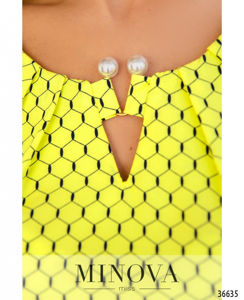 Лёгкая, воздушная, очень нарядная блуза на каждый день или на праздник – в зависимости от того, какой оттенок или принт ты выберешь. В каталоге Minova представлены модели в принт «шестиугольник», в горошек и однотонные. Цвета – пастельные, яркие или классические. Блуза без застёжек и карманов, рукава полной длины, с небольшими манжетами, на манжетах – по одной пуговке. Регулируются на пуговку и ленту. Вырез горловины полукруглый, неглубокий, спереди ткань присобрана и закреплена очаровательной металлической «брошкой» с «жемчужными» наконечниками. Блуза свободного кроя, её лучше носить навыпуск.