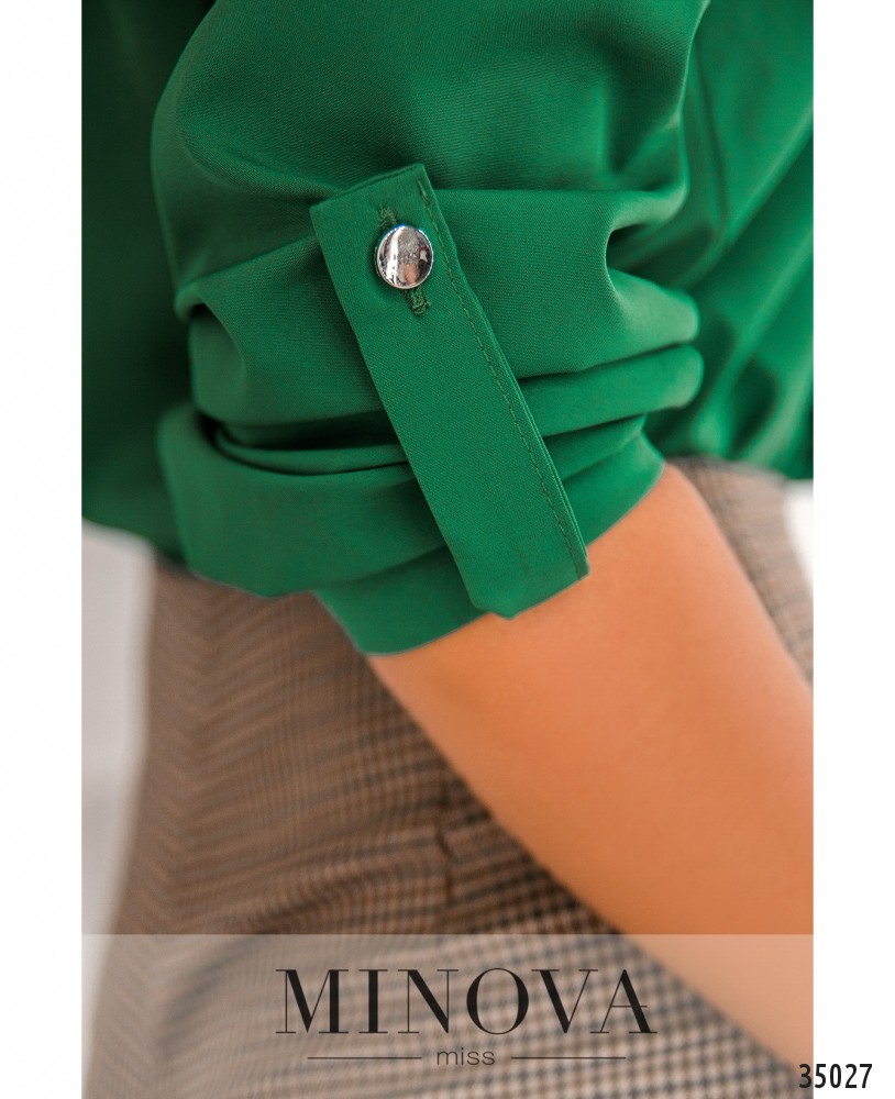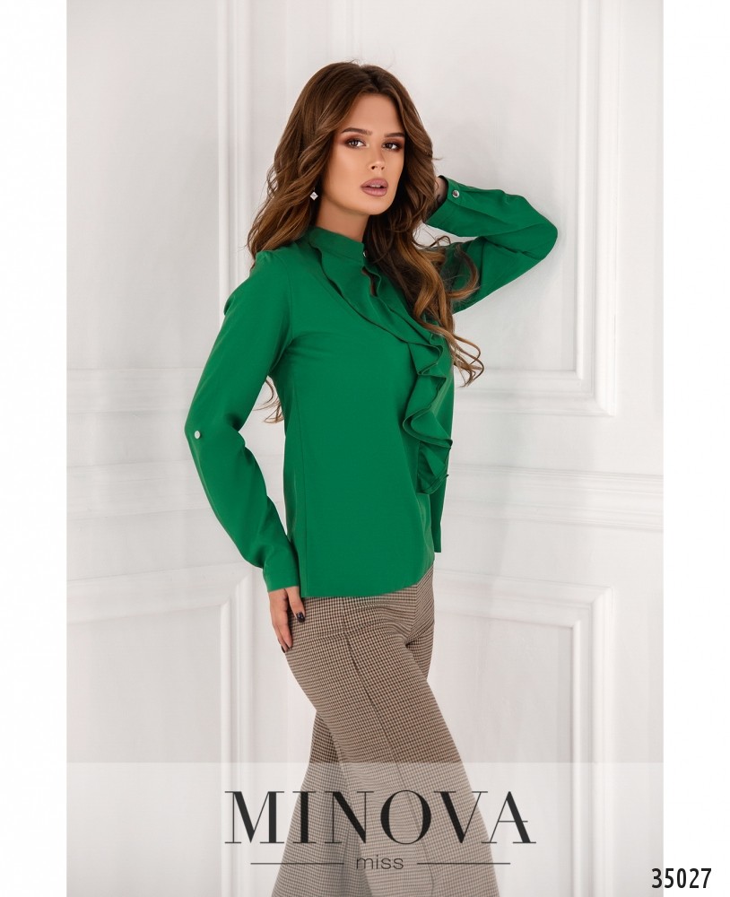 Нежная и стильная блуза с жабо из нового пополнения женской одежды от Minova отлично подойдёт для создания как делового, так и неформального гардероба благодаря разнообразию расцветок – белая, тёмная, зелёная, жёлтая и красная, на любой вкус! Блуза из очень лёгкой ткани, А-силуэта. Рукава полной длины, с манжетами, регулируются на пуговку и ленту. Воротник – небольшая стоечка, застёгивается на пуговку и петельку. Карманов нет. Блузу свободного кроя рекомендуется носить навыпуск с джинсами или брюками, а если сочетаете с юбкой, то лучше заправлять. Однотонная расцветка даёт возожность выбирать подходящие по цвету аксессуары.