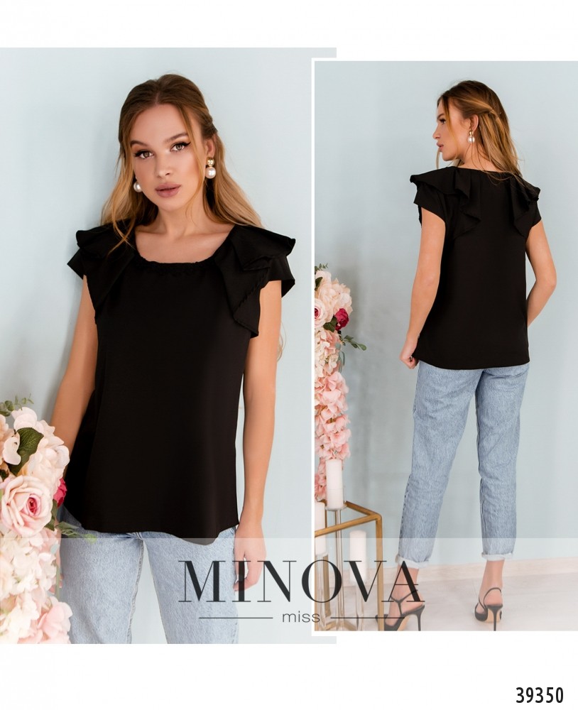 Строгая, но нарядная блуза с рукавом-воланом, вырез горловины полукруглый, украшен тонкой полоской кружева. Карманов и застёжек нет. Крой свободный.