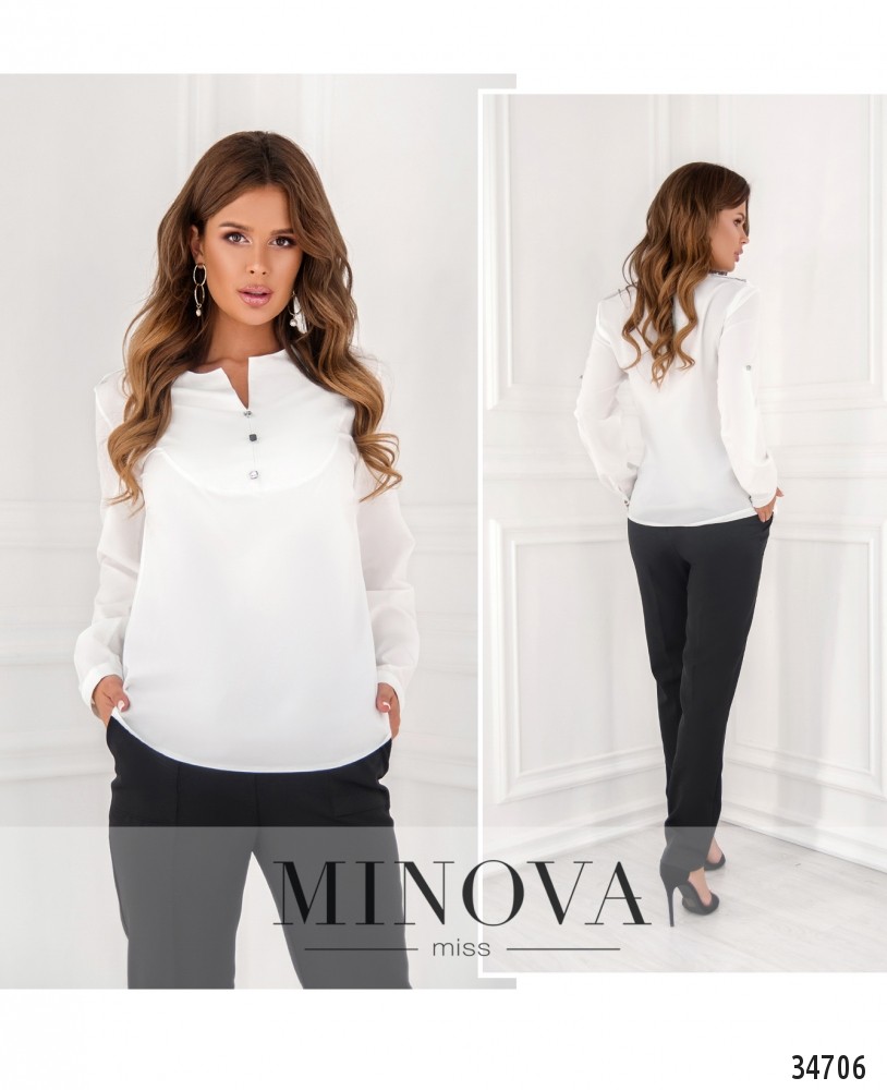 Чистый минимализм и строгость – это новая блуза из коллекции женских нарядов от Minova! Блуза с полукруглым вырезом горловины, от которого по центру располагается небольшой разрез и три декоративных пуговицы. На плечах – погончики с квадратными пуговицами на ножке, и такие же пуговицы с лентой дают возможность регулировать рукава, подворачивая их до локтя. В стандартном положении рукава полной длины, с манжетами, которые застёгиваются на одну пуговицу. На груди – небольшие диагональные вытачки снизу вверх. Застёжек и карманов нет. Прекрасный выбор для офисного наряда, можно носить навыпуск или заправлять в брюки или джинсы, а также расставлять цветовые акценты с помощью ярких аксессуаров. Украшение не входит в комплект. Пояс/аксессуар не входит в комплект.