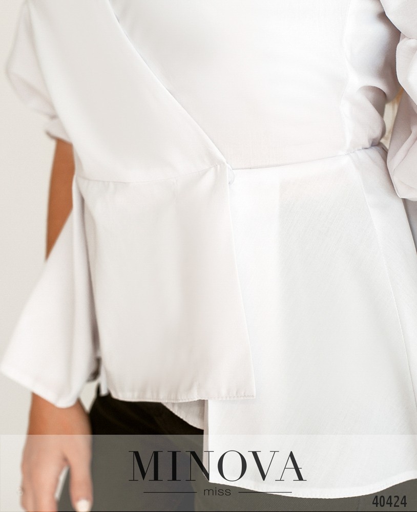 Очаровательная рубашка на запАх, рукава-фонарики, подол асимметричный. ЗапАх застёгивается на пуговицу, изнутри - завязка, подшитая к талии. Подол сзади присобран оборками.