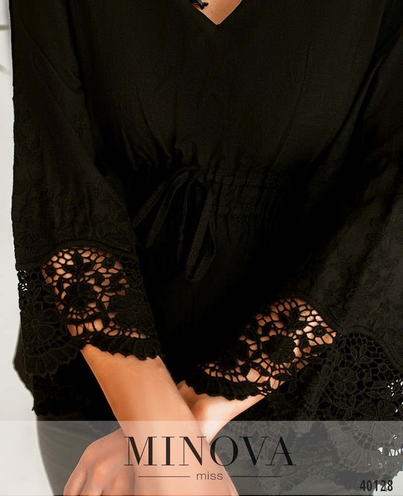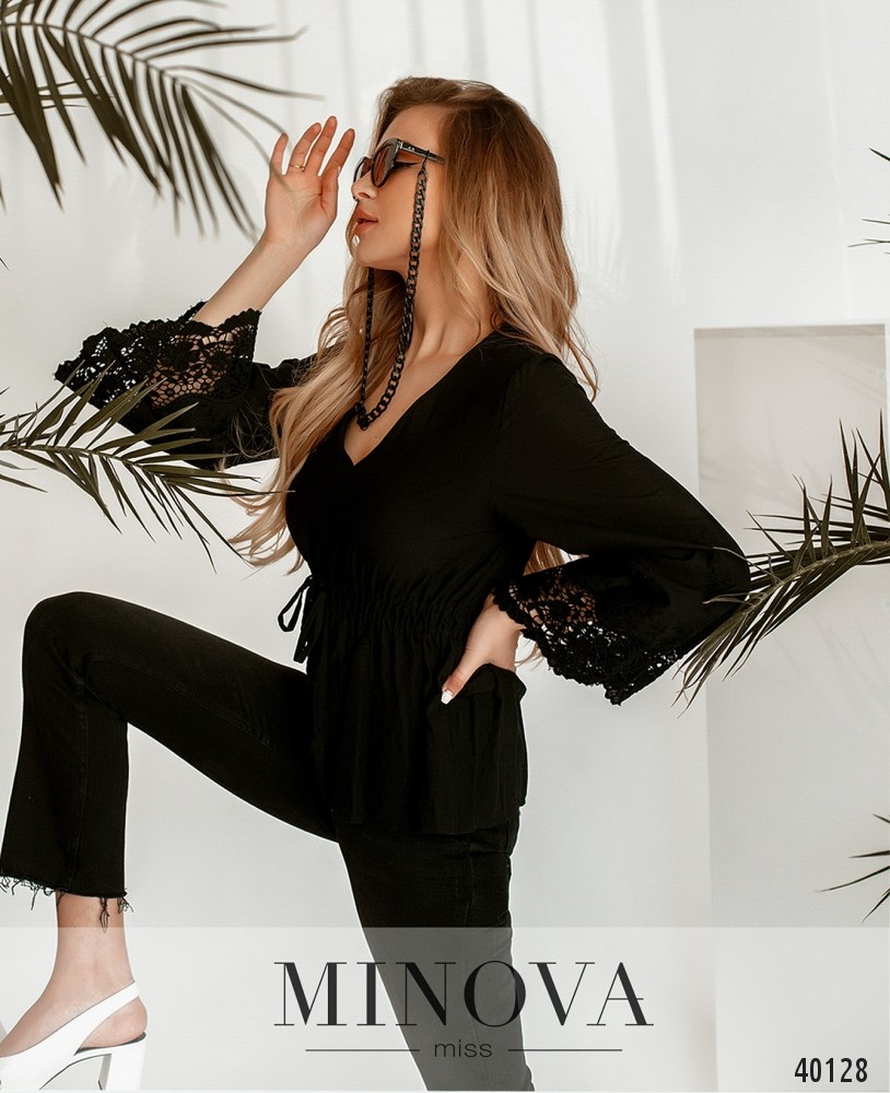 Стильная рубашка с V-образным вырезом горловины, рукава расклешены, украшены нежным цветочным кружевом. В пояс вшит двойной шнурок. Застёжек и карманов нет.