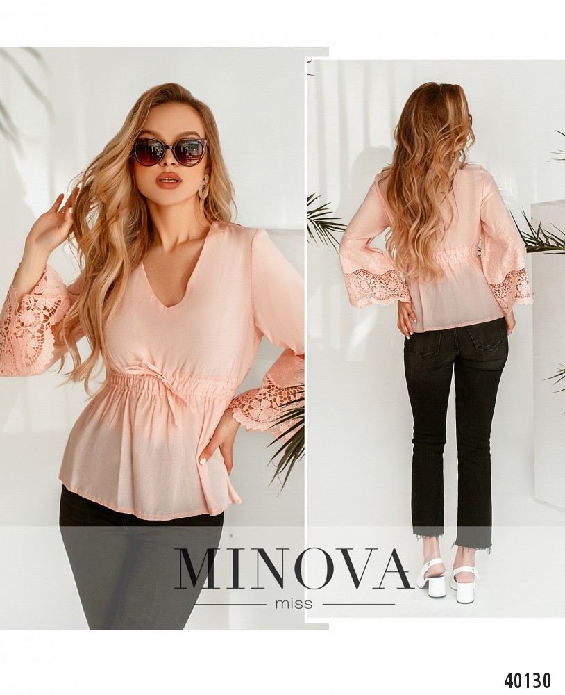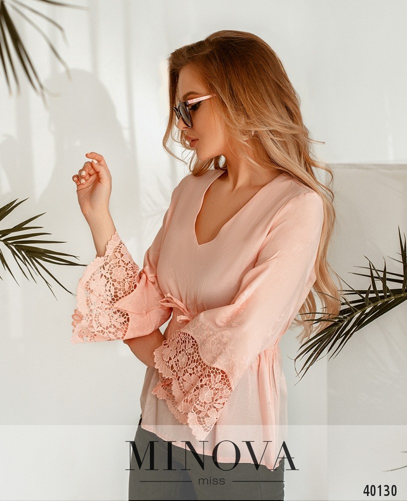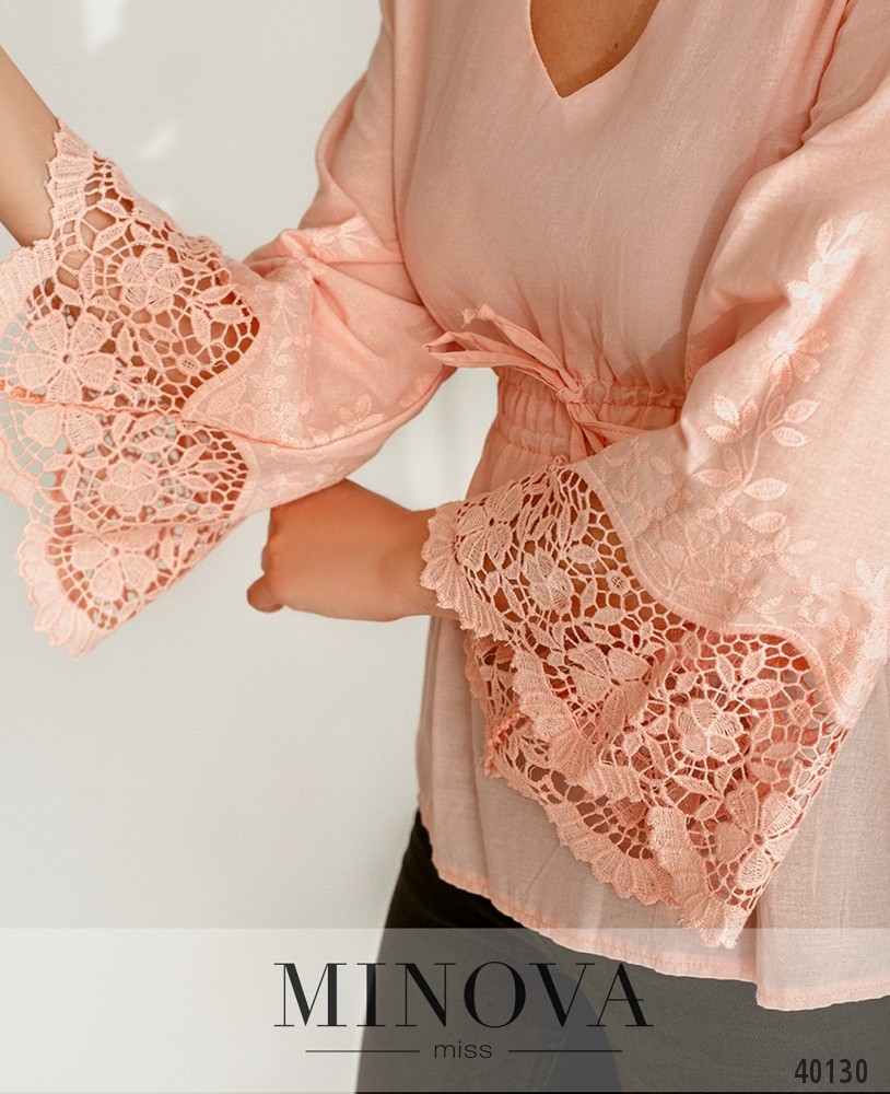 Стильная рубашка с V-образным вырезом горловины, рукава расклешены, украшены нежным цветочным кружевом. В пояс вшит двойной шнурок. Застёжек и карманов нет.