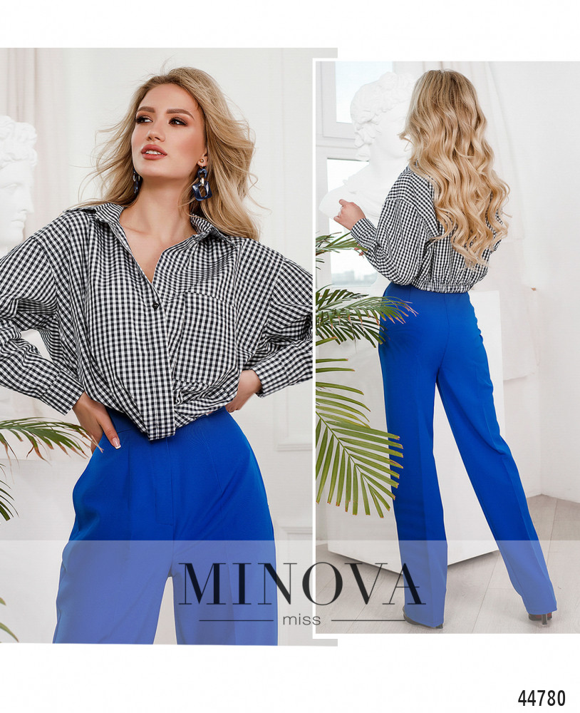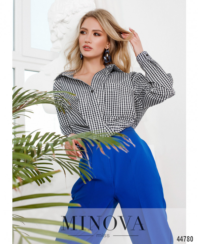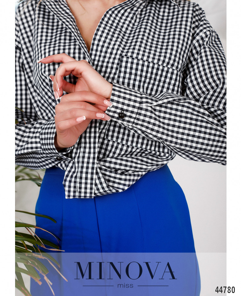 Оригинальная рубашка с отложным воротничком и пуговицами спереди на планке. На груди - накладной карман слева. Рукава с манжетами, на манжетах по одной пуговице. Сзади в подол вшита резинка. Передняя часть полочек подвёрнута и подшита, выглядит как узел.