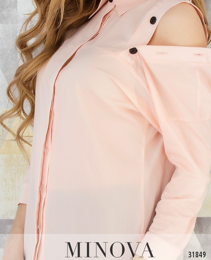 Рубашка с вырезами на плечах и рукавами ¾. Рубашка прямого кроя с отрезной кокеткой. На плечах вырезы застегиваются на пуговицы. На лицевой стороне рубашка застегивается на пуговицы, спрятанные в планке. Рукава собраны в манжеты и застегиваются на пуговицы. Подол закруглен.