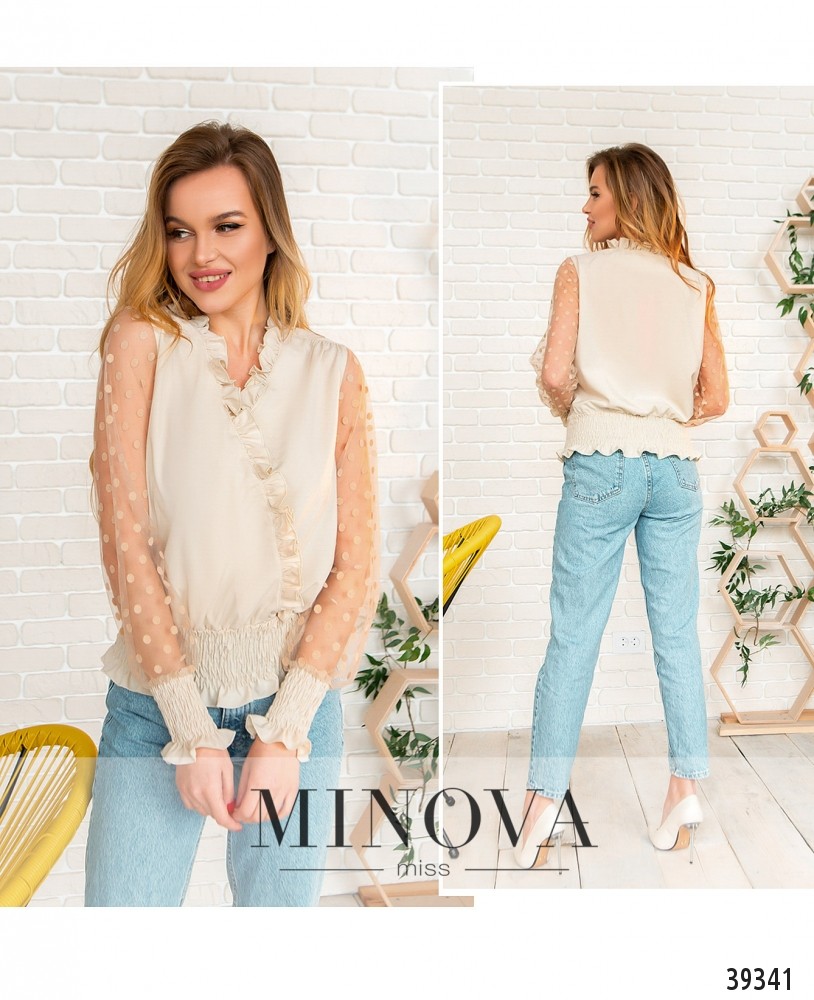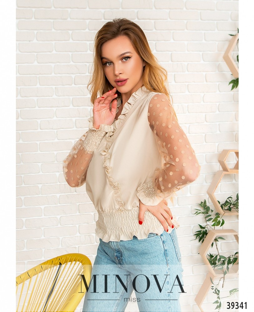 Женственная, изящная, оригинальная блуза, подшитая на запАх. Декольте оторочено аккуратными оборками, а пояс и манжеты присобраны волнистой резинкой, создающей изящные очертания. Рукава из прозрачной сеточки с горошком. Карманов и застёжек нет.