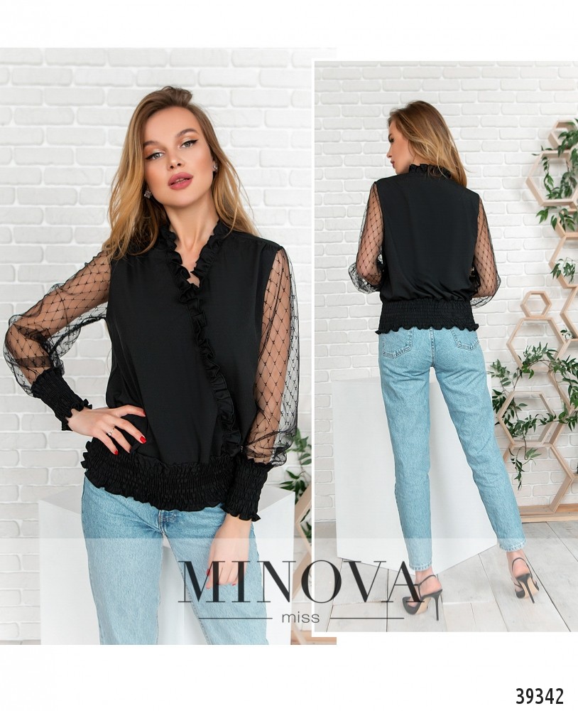 Женственная, изящная, оригинальная блуза, подшитая на запАх. Декольте оторочено аккуратными оборками, а пояс и манжеты присобраны волнистой резинкой, создающей изящные очертания. Рукава из прозрачной сеточки с горошком. Карманов и застёжек нет.