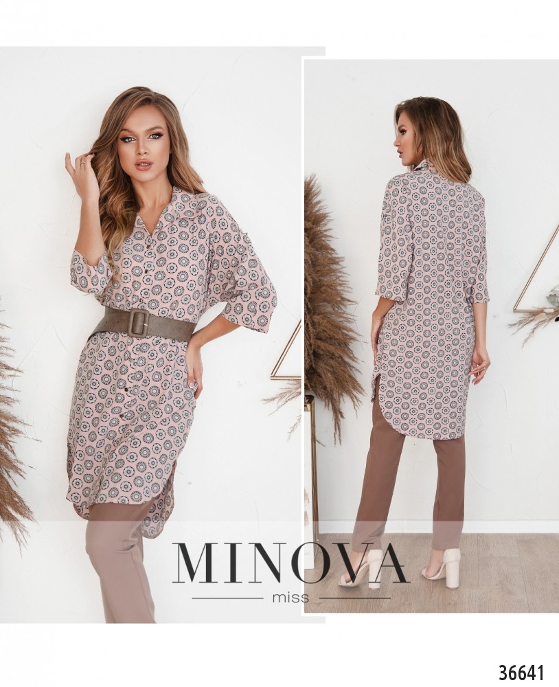 Лёгкая, свободная блузка, которую вполне можно назвать и туникой, и платьем – в новой коллекции женской одежды от Minova. Блузка из приятной ткани пастельного отенка с неброским цветочным принтом, который издалека выглядит как крупный горошек. Воротничок отложной, застёгивается на полный ряд пуговиц от воротника до подола. Подол немного асимметричный: сзади чуть длиннее, по бокам – небольшие разрезы. Рукава длиной 3/4, без манжет, их можно отрегулировать до совсем коротких с помощью пуговки и ленты. Карманы отсутствуют. Прекрасный повседневный вариант, можно носить как самостоятельный элемент или в сочетании с джинсами или леггинсами.