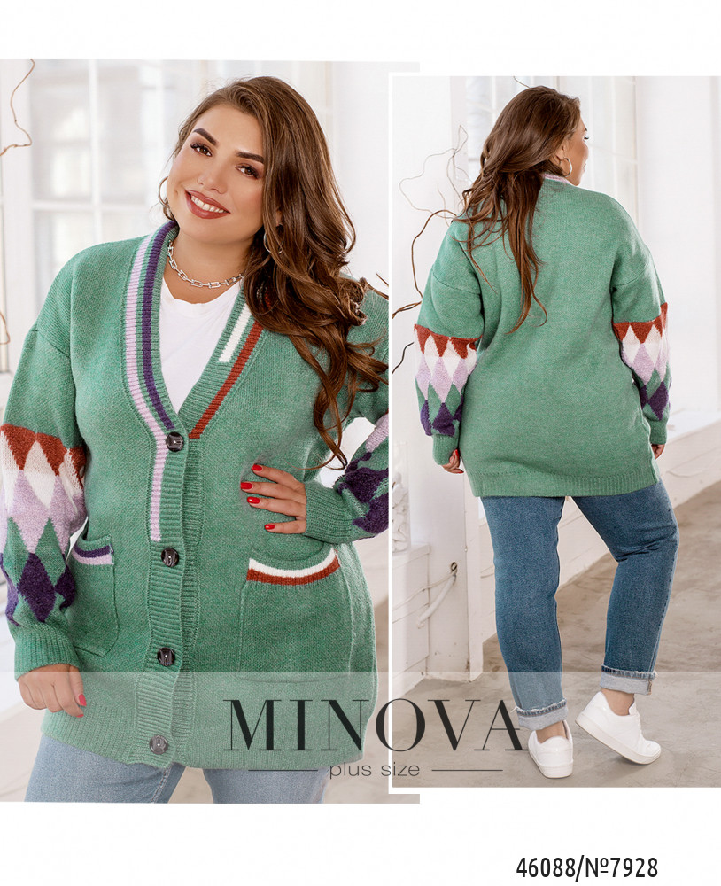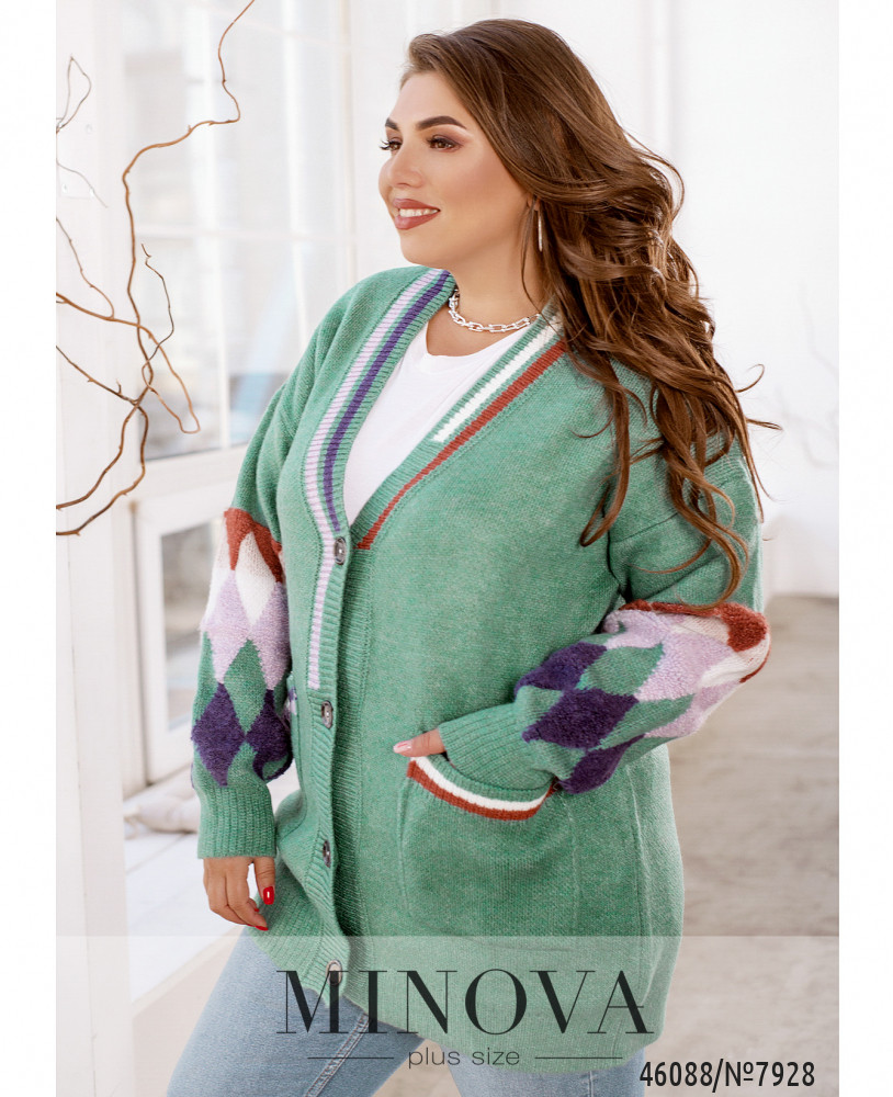 Вязаная кофта-кардиган с накладными карманами станет универсальной для вас, ведь с ней можно создавать действительно стильные и яркие образы. Изюминкой данной модели безусловной являются рукава, украшенные ярким геометрическим орнаментом.