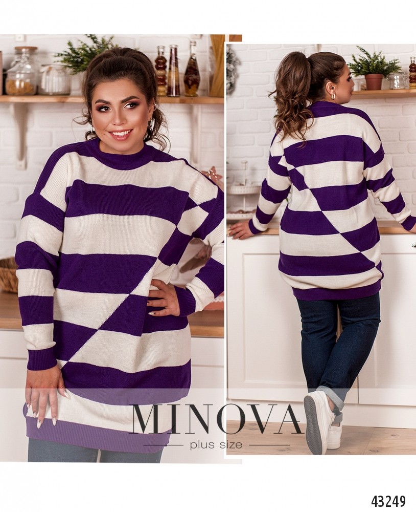 Оригинальный свитер плюс сайз с асимметричным принтом, с небольшими мягкими манжетами на рукавах, подоле и горловине. Застёжек и карманов нет.