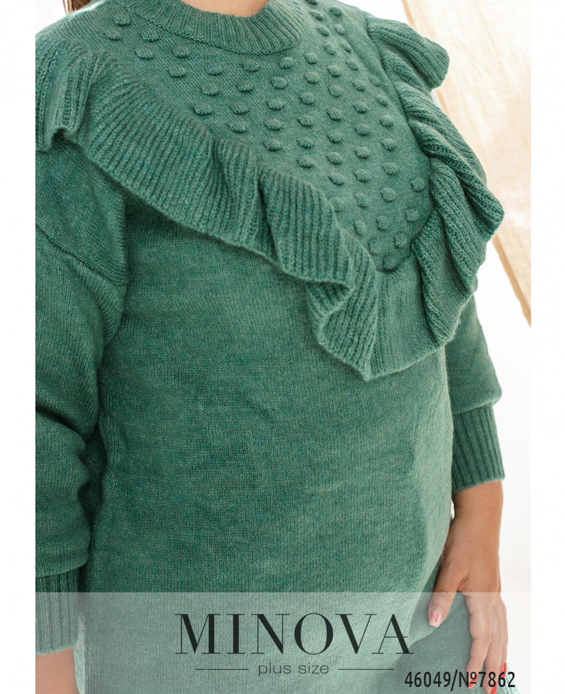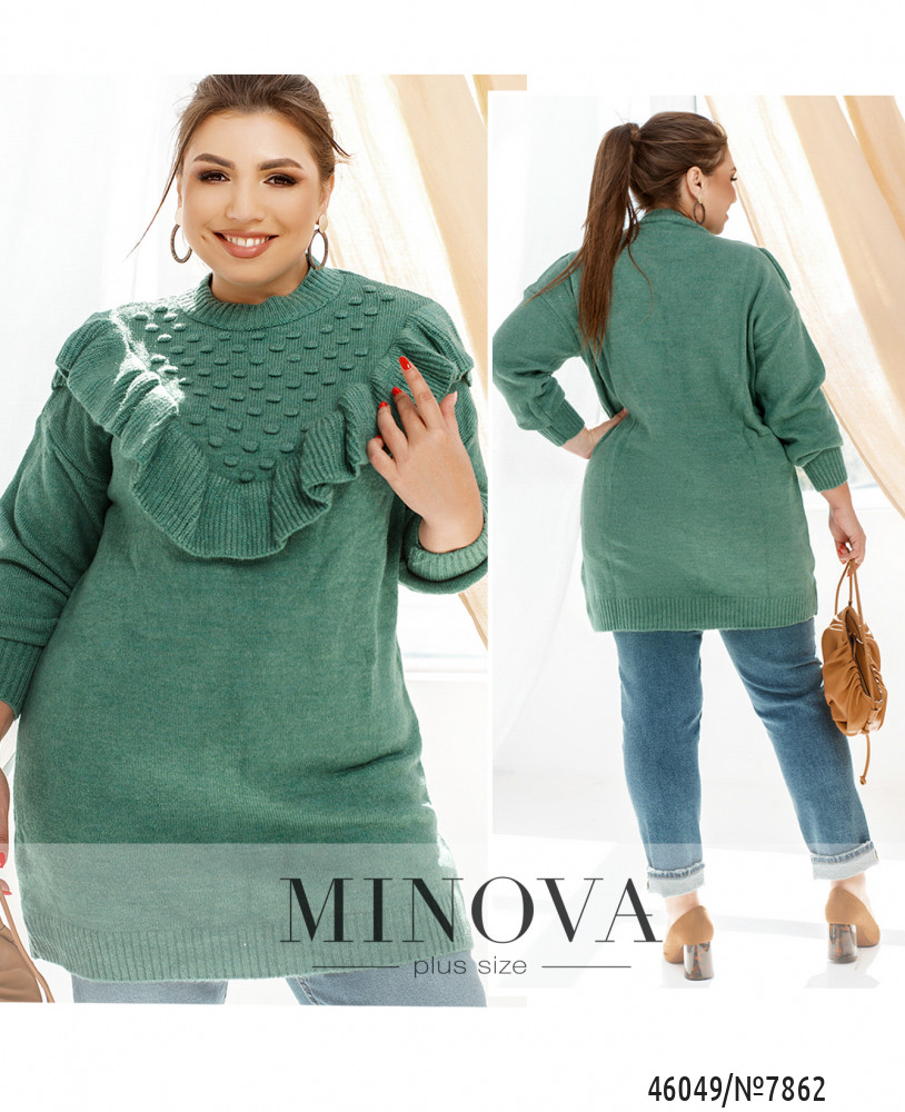 Женственный удлиненный свитер-туника привлекает внимание необычной фактурой и удобством. Модель с нежными вязаными оборками спереди груди поможет создать нежный образ в романтическом стиле.